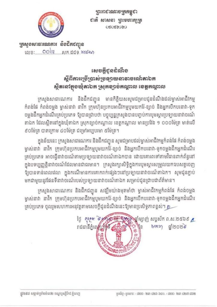 ក្នុងន័យនេះ ក្រសួងសាធារណការ និងដឹកជញ្ជូន សូមជម្រាបដល់ម្ចាស់អាជីវកម្មកំពង់ផែ កំពង់ចម្លង ម្ចាស់នាវា នាវិក ក្រុមហ៊ុនប្រកបអាជីវកម្មបូមយករ៉ែ-ខ្សាច់ និងអ្នកបើកបរនាវា-ទូកចម្លងដឹកអ្នកដំណើរ គ្រប់ប្រភេទ អាចធ្វើនាវាចរណ៍តាមប្រឡាយនាវាចរណ៍តាឯកបាន ដោយគោរពទៅតាមវិធានពាក់ព័ន្ធនៅ ក្នុងបទប្បញ្ញត្តិនាវាចរណ៍ដែលមានជាធរមាន។ ក្រសួងរក្សាសិទ្ធិក្នុងការបូមស្តារសម្រួលយកឧបសគ្គចេញ ឱ្យបានទាន់ពេលវេលា ក្នុងករណីមានការគោករាក់ផ្សេងៗនៅប្រឡាយនាវាចរណ៍តាឯក សូមជូនភ្ជាប់មកជាមួយនូវផែនទីនាវាចរណ៍របស់ប្រឡាយនាវាចរណ៍តាឯក សម្រាប់ជូនជ្រាបជាព័ត៌មាន។ ក្រសួងសាធារណការ និងដឹកជញ្ជូន សង្ឃឹមយ៉ាងមុតមាំថា ម្ចាស់អាជីវកម្មកំពង់ផែ កំពង់ចម្លង ម្ចាស់នាវា នាវិក ក្រុមហ៊ុនប្រកបអាជីវកម្មបូមយករ៉ែ-ខ្សាច់ និងអ្នកបើកបរនាវា-ទូកចម្លងដឹកអ្នកដំណើរ គ្រប់ប្រភេទ ចូលរួមសហការអនុវត្តតាមសេចក្ដីជូនដំណឹងនេះឱ្យមានប្រសិទ្ធភាពខ្ពស់៕ រក្សាសិទ្ធដោយ៖សុទ្ធលី