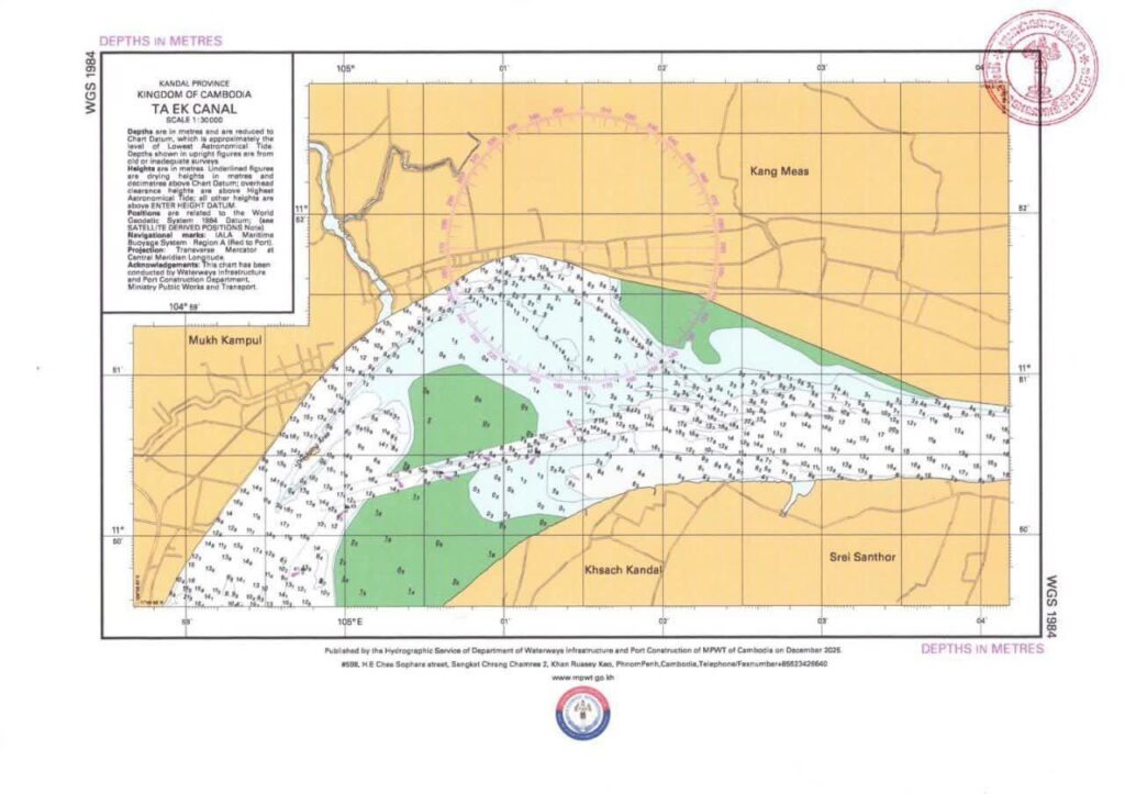 ខេត្តកណ្តាល៖ ក្រសួងសាធារណការ និងដឹកជញ្ជូន មានកិត្តិយសសូមជម្រាបជូនដំណឹងដល់ម្ចាស់អាជីវកម្ម កំពង់ផែ កំពង់ចម្លង ម្ចាស់នាវា នាវិក ក្រុមហ៊ុនប្រកបអាជីវកម្មបូមយករ៉ែ-ខ្សាច់ និងអ្នកបើកបរនាវា-ទូក ចម្លងដឹកអ្នកដំណើរគ្រប់ប្រភេទ ឱ្យបានជ្រាបថា បច្ចុប្បន្នក្រសួងបានបញ្ចប់ការបូមស្តារប្រឡាយនាវាចរណ៍ តាឯក ដែលស្ថិតនៅក្នុងឃុំតាឯក ស្រុកខ្សាច់កណ្តាល ខេត្តកណ្តាល មានប្រវែង ១០០០ម៉ែត្រ មាត់លើ ៩០ម៉ែត្រ បាតក្រោម ៤០ម៉ែត្រ ជម្រៅអប្បបរមា ៥ម៉ែត្រ។