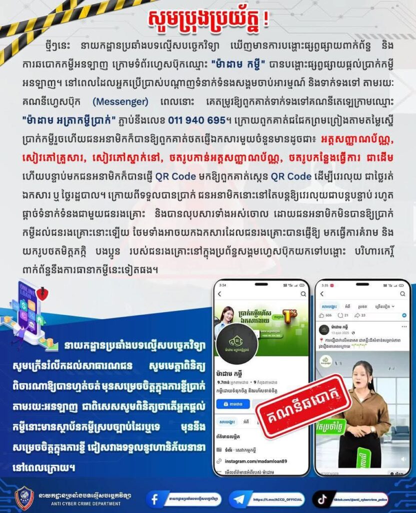 ភ្នំពេញ ៖ សូមប្រុងប្រយ័ត្ន !!! ថ្មីៗនេះ នាយកដ្ឋានប្រឆាំងបទល្មើសបច្ចេកវិទ្យា ឃើញមានការបង្ហោះផ្សព្វផ្សាយពាក់ព័ន្ធ និងការឆបោកកម្ចីអនទ្បាញ ក្រោមទំព័រហ្វេសប៊ុកឈ្មោះ “ម៉ាដាម កម្ចី” បានបង្ហោះផ្សព្វផ្សាយផ្តល់ប្រាក់កម្ចីអនឡាញ។ នៅពេលដែលអ្នកប្រើប្រាស់បណ្តាញទំនាក់ទំនងសង្គមចាប់អារម្មណ៍ និងទាក់ទងទៅ តាមរយៈគណនីហ្វេសប៊ុក (Messenger) ពេលនោះ គេតម្រូវឱ្យពួកគាត់ទាក់ទងទៅគណនីតេឡេក្រាមឈ្មោះ “ម៉ាដាម អត្រាកម្ចីប្រាក់” ភ្ជាប់នឹងលេខ 011 940 695។