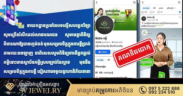 នាយកដ្ឋានប្រឆាំងបទល្មើសបច្ចេកវិទ្យា សូមក្រើនរំលឹកដល់សាធារណជន សូមមេត្តាពិនិត្យ ពិចារណាអោយបានហ្មត់ចត់ មុនសម្រេចចិត្តក្នុងការខ្ចីប្រាក់តាមរយ:អនឡាញ ជាពិសេសសូមពិនិត្យថាតើអ្នកផ្តល់កម្ចីនោះមានស្ថាប័នកម្ចីស្របច្បាប់ដែរឬទេ មុននឹងសម្រេចចិត្តក្នុងការខ្ចី ជៀសវាងទទួលនូវហនិភ័យនានានៅពេលក្រោយ។ រក្សាសិទ្ធដោយ៖សុទ្ធលី