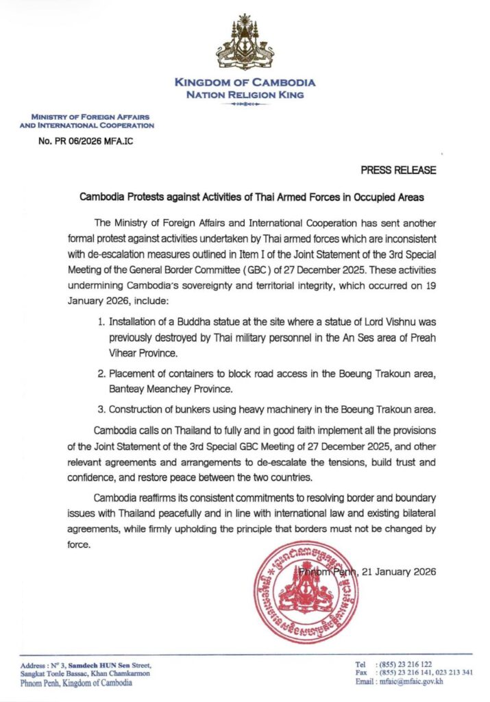 ក្រសួងការបរទេស និងសហប្រតិបត្តិការអន្តរជាតិ បានតវ៉ាផ្លូវការជាថ្មីម្ដងទៀតប្រឆាំងចំពោះ សកម្មភាពរបស់កងកម្លាំងប្រដាប់អាវុធថៃ ដែលផ្ទុយទៅនឹងវិធានការកាត់បន្ថយភាពតានតឹង ដែលមាន ចែងក្នុងចំណុចទី១ នៃសេចក្តីប្រកាសរួម នៃកិច្ចប្រជុំពិសេសលើកទី៣ របស់គណៈកម្មាធិការព្រំដែន ទូទៅ (GBC) ចុះថ្ងៃទី២៧ ខែធ្នូ ឆ្នាំ២០២៥។ សកម្មភាពទាំងនេះ ដែលបានប៉ះពាល់ធ្ងន់ធ្ងរដល់ អធិបតេយ្យ និងបូរណភាពទឹកដីរបស់កម្ពុជា បង្កឡើងនៅថ្ងៃទី១៩ ខែមករា ឆ្នាំ២០២៦ រួមមានដូចជា៖ ១. ការតម្កល់រូបសំណាកព្រះពុទ្ធបដិមា នៅលើទីតាំងរូបសំណាកបដិមាព្រះវិស្ណុ ដែលត្រូវ បានបំផ្លាញដោយមន្ត្រីយោធាថៃ នៅតំបន់អានសេះ ខេត្តព្រះវិហារ។