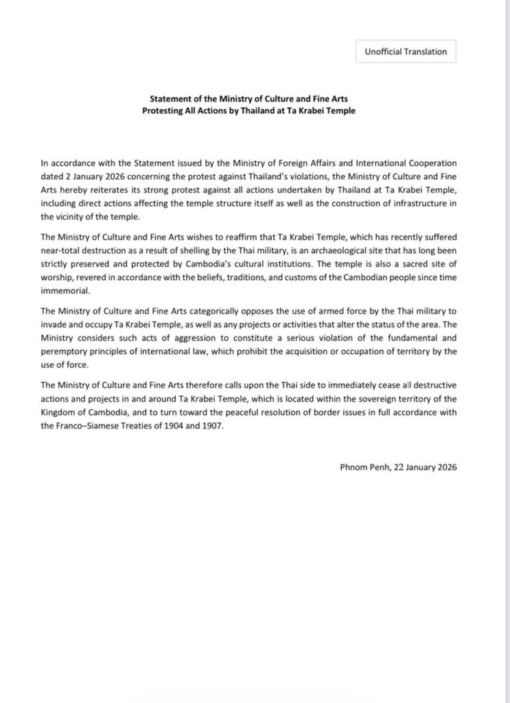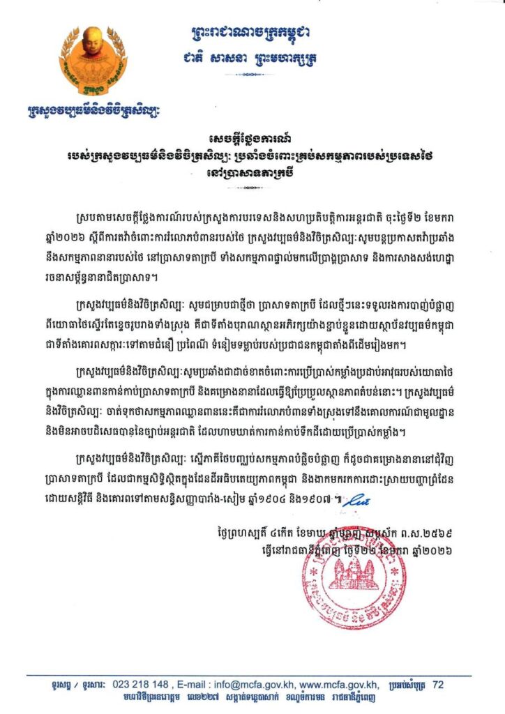 ភ្នំពេញ ៖ ស្របតាមសេចក្តីថ្លែងការណ៍របស់ក្រសួងការបរទេសនិងសហប្រតិបត្តិការអន្តរជាតិ ចុះថ្ងៃទី២ ខែមករា ឆ្នាំ២០២៦ ស្តីពីការតវ៉ាចំពោះការរំលោភបំពានរបស់ថៃ ក្រសួងវប្បធម៌និងវិចិត្រសិល្បៈ សូមបន្តប្រកាសតវ៉ាប្រឆាំង នឹងសកម្មភាពនានារបស់ថៃ នៅប្រាសាទតាក្របី ទាំងសកម្មភាពផ្ទាល់មកលើប្រាង្គប្រាសាទ និងការសាងសង់ហេដ្ឋា រចនាសម្ព័ន្ធនានាជិតប្រាសាទ។