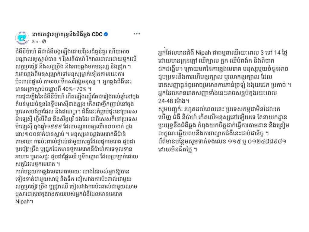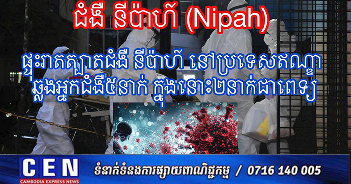 ភ្នំពេញ ៖ នាយកដ្ឋានប្រយុទ្ធនឹងជំងឺឆ្លង (CDC ) បានចេញសេចក្តីជូនដំណឹងថា ជំងឺនីប៉ាហ៍ គឺជាជំងឺបង្កឡើងដោយវីរុសដ៏ធ្ងន់ធ្ងរ ហើយអាច បណ្តាលឲ្យស្លាប់បាន ។ វីរុសនីប៉ាហ៍ រីករាលដាលដោយផ្ទុកលើ សត្វប្រចៀវ និងសត្វច្រឹង និងអាចឆ្លងមកមនុស្ស និងជ្រូក ។ វាអាចឆ្លងពីមនុស្សម្នាក់ទៅមនុស្សម្នាក់ទៀតតាមរយៈការ ប៉ះពាល់ផ្ទាល់ តាមរយៈទឹកសរីរាង្គមនុស្ស ។ អ្នកឆ្លងជំងឺនេះ មានអត្រាស្លាប់ចន្លោះពី 40%–70% ។ ការផ្ទុះឡើងនៃជំងឺនីប៉ាហ៍ កើតឡើងស្ទើរតែជារៀងរាល់ឆ្នាំនៅក្នុង តំបន់មួយចំនួននៃទ្វីបអាស៊ីខាងត្បូង កើតជាញឹកញាប់នៅក្នុង ប្រទេសបង់ក្លាដែស និងឥណគ្នា។ ជំងឺនេះក៏ធ្លាប់ផ្ទុះនៅប្រទេស ម៉ាឡេស៊ី ហ្វីលីពីន និងសឹង្ហបុរី ផងដែរ ជាពិសេសគឺនៅប្រទេស ម៉ាឡេស៊ី ក្នុងឆ្នាំ១៩៩៩ ដែលបណ្តាលឲ្យឈឺ៣០០នាក់ ក្នុង នោះ១០០នាក់បានស្លាប់ ។ មនុស្សអាចឆ្លងមេរោគនីប៉ាន៍ តាមរយៈ ការប៉ះពាល់ផ្ទាល់ជាមួយសត្វដែលផ្ទុកមេរោគ ដូចជា ប្រចៀវ ច្រឹង ឬជ្រូកដែកមានផ្ទុកមេរោគនីប៉ាហ៍ការទទួលទាន អាហារ ឬភេសជ្ជៈ ដូចជាផ្លែឈើ ឬទឹកត្នោត ដែលប្រឡាក់ដោយ សត្វដែលផ្ទុកមេរោគ ។