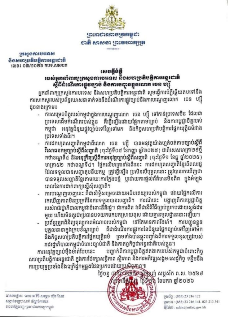 ភ្នំពេញ ៖ អ្នកនាំពាក្យក្រសួងការបរទេស និងសហប្រតិបត្តិការអន្តរជាតិ នៅថ្ងៃទី២៦ ខែមករា ឆ្នាំ២០២៦ សូមធ្វើការបំភ្លឺឆ្លើយតបទៅនឹង ការសាកសួររបស់ប្រព័ន្ធឃោសនាទាក់ទងនឹងដំណើរការផ្លូវច្បាប់និងការបណ្ដេញលោក ចេន ហ្ស៊ី ដូចខាងក្រោម៖ ការសម្រេចចិត្តរបស់កម្ពុជាក្នុងការបណ្តេញលោក ចេន ហ្ស៊ី ទៅកាន់ប្រទេសចិន ដែលជា ប្រទេសដើមកំណើតរបស់ខ្លួន គឺធ្វើឡើងដោយផ្អែកតាមច្បាប់ និងការប្តេជ្ញាចិត្តរបស់ កម្ពុជា អនុវត្តជំនួយផ្លូវច្បាប់ទៅវិញទៅមក និងកិច្ចសហប្រតិបត្តិការផ្នែកយុត្តិធម៌រវាង ប្រទេសទាំងពីរ។