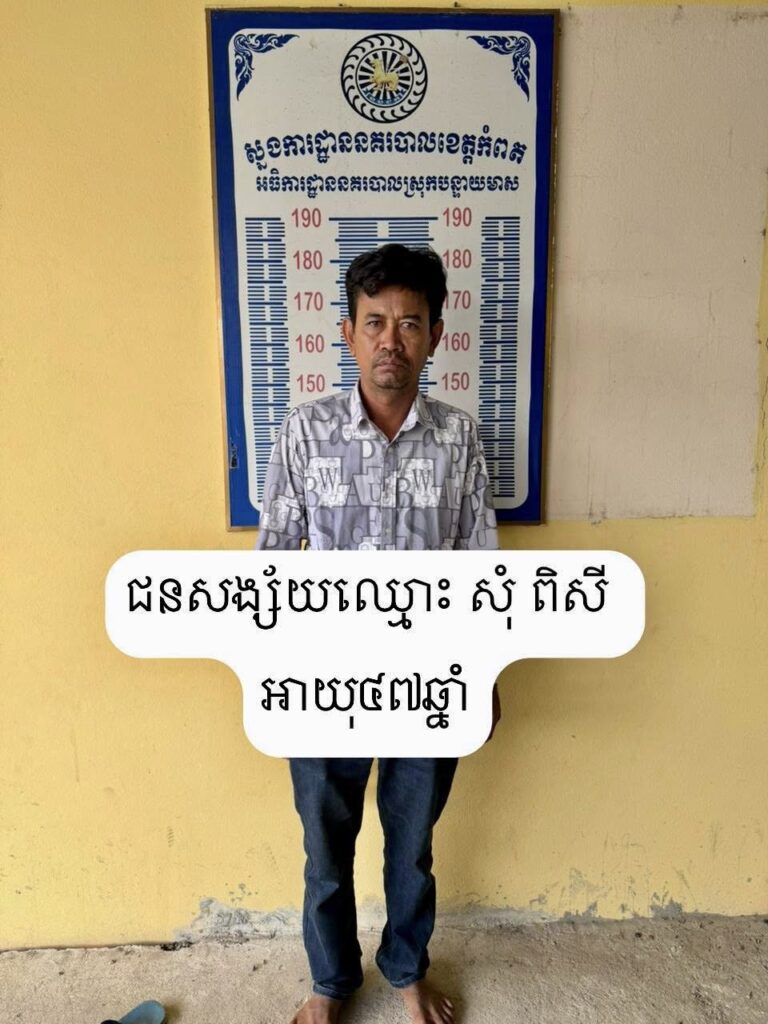 ករណីនេះសមត្ថកិច្ចបានចាប់ខ្លួនជនសង្ស័យឈ្មោះសុំ ពិសី អាយុ៤៧ឆ្នាំ រស់នៅភូមិជុំ ឃុំត្នោតចុងស្រង់ ស្រុកបន្ទាយមាសខាងកើត ខេត្តកំពត។ ហេតុការណ៍នេះបានកើតឡើងកាលពីថ្ងៃទី២៨ខែមករាឆ្នាំ២០២៦ស្ថិតនៅភូមិជុំ ឃុំត្នោតចុងស្រង់ ស្រុកបន្ទាយមាសខាងកើត ខេត្តកំពត៕ រក្សាសិទ្ធដោយ៖សុទ្ធលី