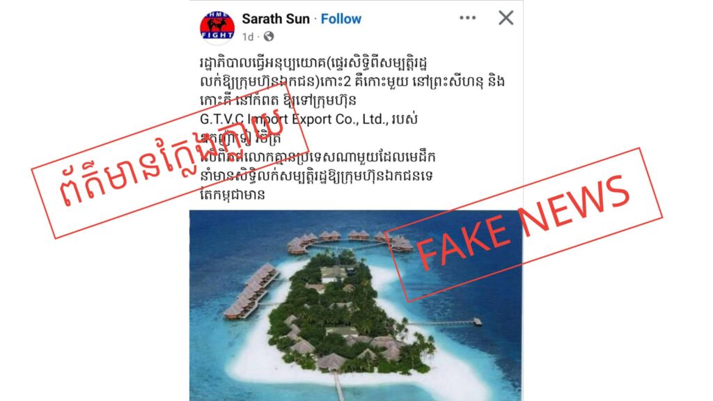 ភ្នំពេញ ៖ ក្រុមប្រឹក្សាអភិវឌ្ឍន៍កម្ពុជាបានកត់សម្គាល់ឃើញថាមានការផ្សព្វផ្សាយតាមបណ្តាញសង្គមនូវព័ត៌មានមិនពិតថា រាជរដ្ឋាភិបាលបានលក់កោះមួយ នៅខេត្តព្រះសីហនុ និងកោះគី នៅខេត្តកំពត ទៅឱ្យក្រុមហ៊ុនឯកជន។