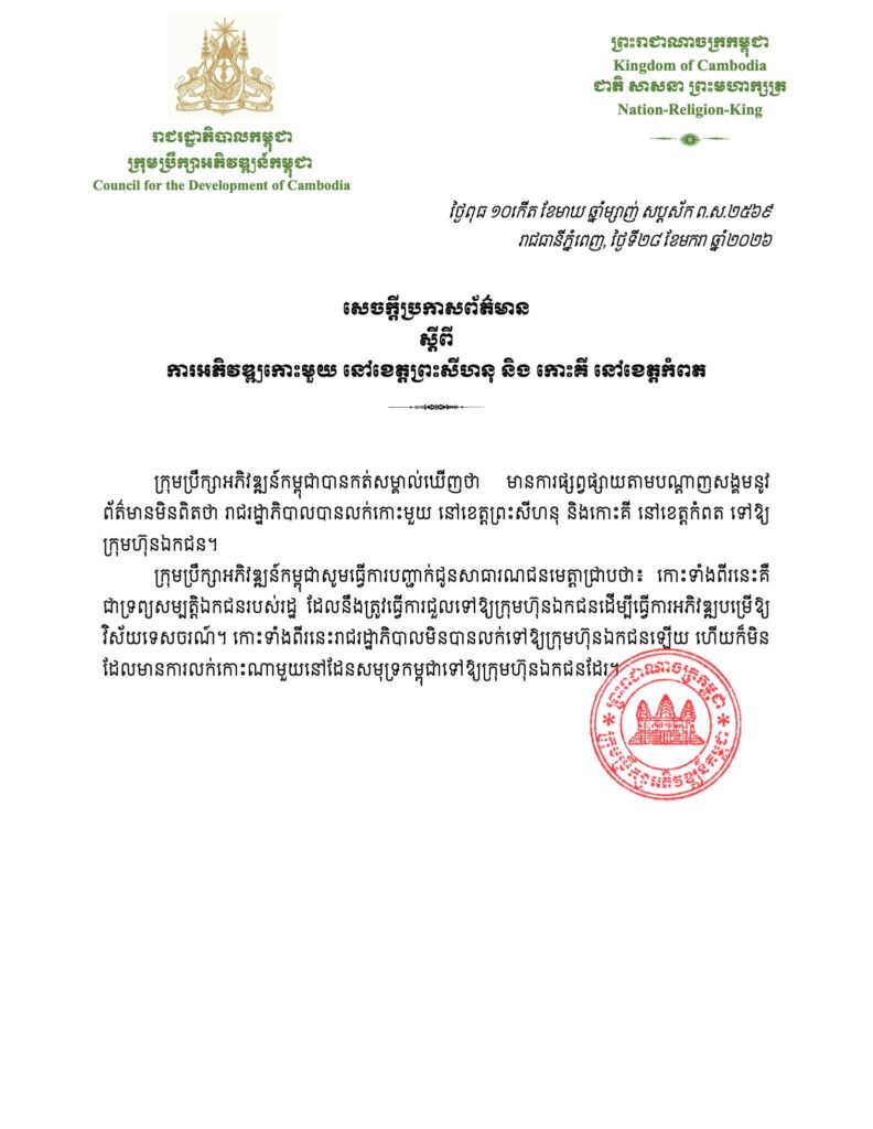 ក្រុមប្រឹក្សាអភិវឌ្ឍន៍កម្ពុជាសូមធ្វើការបញ្ជាក់ជូនសាធារណជនមេត្តាជ្រាបថា៖ កោះទាំងពីរនេះគឺជាទ្រព្យសម្បត្តិឯកជនរបស់រដ្ឋ ដែលនឹងត្រូវធ្វើការជួលទៅឱ្យក្រុមហ៊ុនឯកជនដើម្បីធ្វើការអភិវឌ្ឍបម្រើឱ្យវិស័យទេសចរណ៍។ កោះទាំងពីរនេះរាជរដ្ឋាភិបាលមិនបានលក់ទៅឱ្យក្រុមហ៊ុនឯកជនឡើយ ហើយក៏មិនដែលមានការលក់កោះណាមួយនៅដែនសមុទ្រកម្ពុជាទៅឱ្យក្រុមហ៊ុនឯកជនដែរ៕ រក្សាសិទ្ធដោយ៖សុទ្ធលី