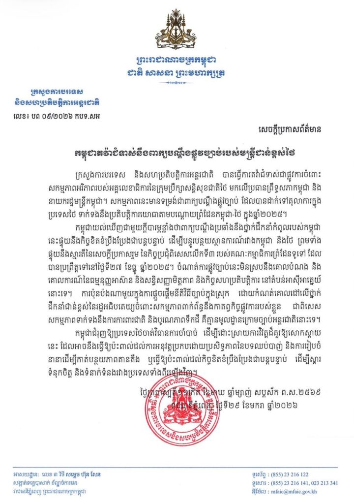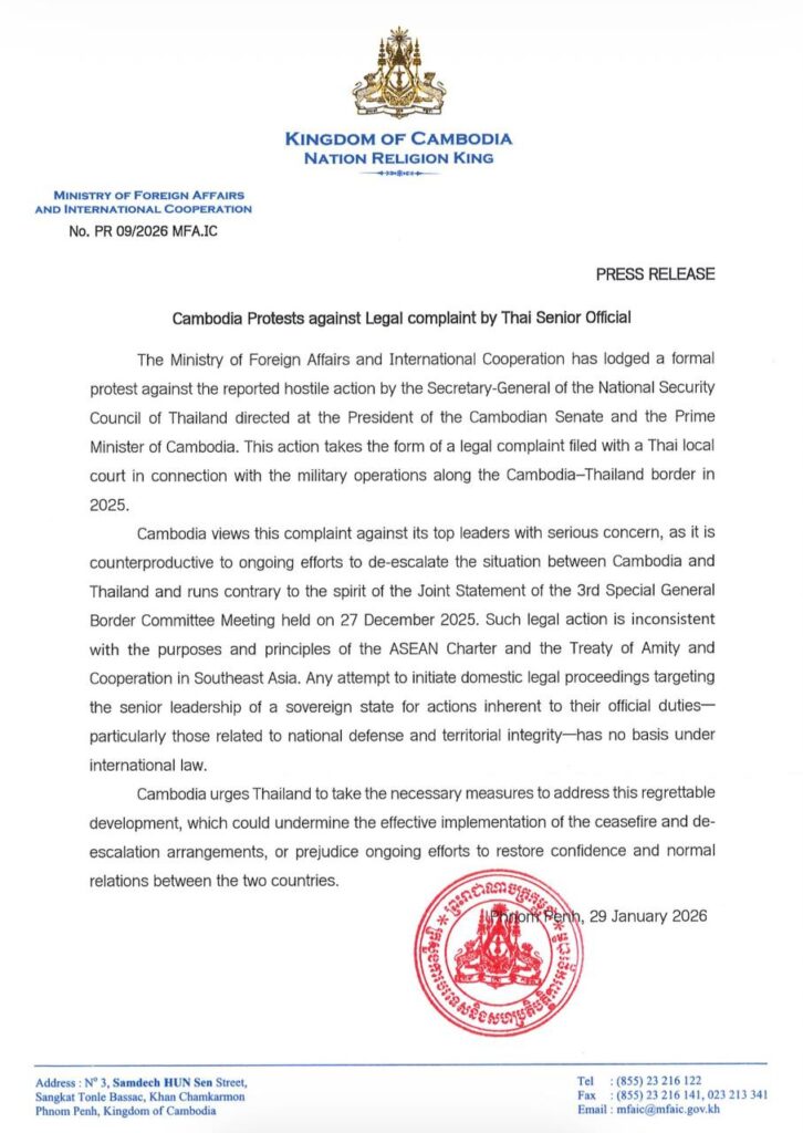 កម្ពុជាយល់ឃើញជាមួយក្តីបារម្ភខ្លាំងថាពាក្យបណ្តឹងប្រឆាំងនឹងថ្នាក់ដឹកនាំកំពូលរបស់កម្ពុជា នេះផ្ទុយនឹងកិច្ចខិតខំប្រឹងប្រែងជាបន្តបន្ទាប់ ដើម្បីបន្ធូរបន្ថយស្ថានការណ៍រវាងកម្ពុជា និងថៃ ព្រមទាំង ផ្ទុយនឹងស្មារតីនៃសេចក្ដីប្រកាសរួម នៃកិច្ចប្រជុំពិសេសលើកទី៣ របស់គណៈកម្មាធិការព្រំដែនទូទៅ ដែល បានប្រព្រឹត្តទៅនៅថ្ងៃទី២៧ ខែធ្នូ ឆ្នាំ២០២៥។ ចំណាត់ការផ្លូវច្បាប់នេះមិនស្របនឹងគោលបំណង និង គោលការណ៍នៃធម្មនុញ្ញអាស៊ាន និងសន្ធិសញ្ញាមិត្តភាព និងកិច្ចសហប្រតិបត្តិការ នៅតំបន់អាស៊ីអាគ្នេយ៍ នោះទេ ការប៉ុនប៉ងណាមួយក្នុងការផ្តួចផ្តើមនីតិវិធីច្បាប់ក្នុងស្រុក ដោយកំណត់គោលដៅលើថ្នាក់ ដឹកនាំជាន់ខ្ពស់នៃរដ្ឋអធិបតេយ្យចំពោះសកម្មភាពពាក់ព័ន្ធនឹងកាតព្វកិច្ចផ្លូវការរបស់ខ្លួន ជាពិសេស សកម្មភាពទាក់ទងនឹងការការពារជាតិ និងបូរណភាពទឹកដី គឺគ្មានមូលដ្ឋានក្រោមច្បាប់អន្តរជាតិនោះទេ។