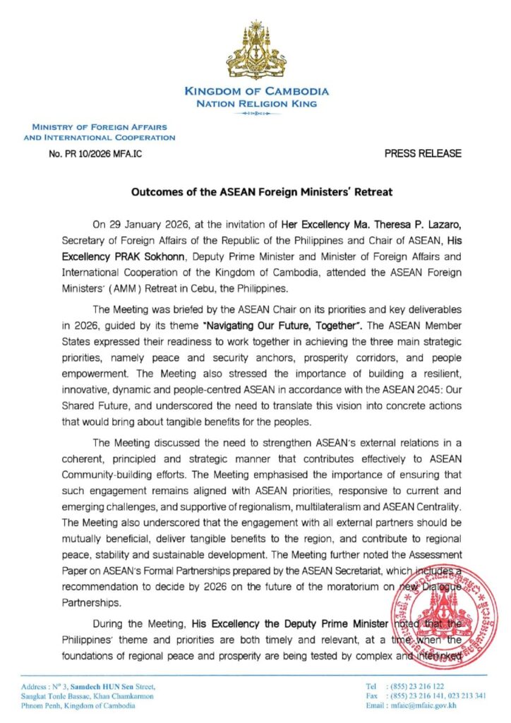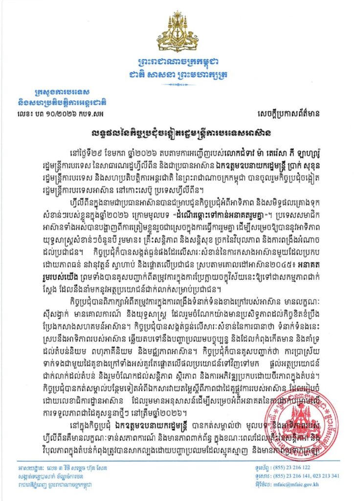 ភ្នំពេញ ៖ នៅថ្ងៃទី២៩ ខែមករា ឆ្នាំ២០២៦ តបតាមការអញ្ជើញរបស់លោកជំទាវ ម៉ តេរ៉េសា ភី ឡាហ្សារ៉ូ រដ្ឋមន្ត្រីការបរទេស នៃសាធារណរដ្ឋហ្វីលីពីន និងជាប្រធានអាស៊ាន ឯកឧត្ដមឧបនាយករដ្ឋមន្ត្រី ប្រាក់ សុខុន រដ្ឋមន្ត្រីការបរទេស និងសហប្រតិបត្តិការអន្តរជាតិ នៃព្រះរាជាណាចក្រកម្ពុជា បានចូលរួមកិច្ចប្រជុំចង្អៀត រដ្ឋមន្ត្រីការបរទេសអាស៊ាន នៅកោះសេប៊ូ ប្រទេសហ្វីលីពីន។