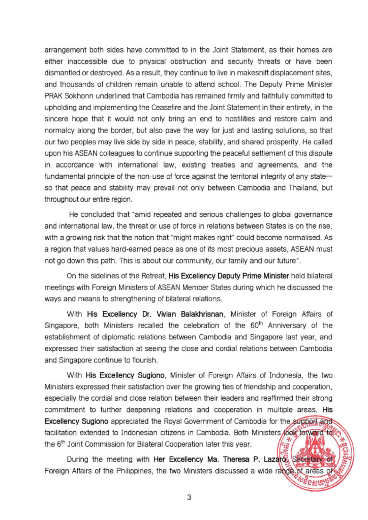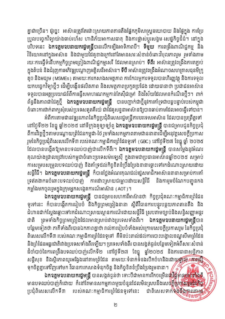 ឯកឧត្តមឧបនាយករដ្ឋមន្ត្រី បានជម្រាបសហការីអាស៊ានថា កិច្ចប្រជុំគណៈកម្មាធិការព្រំដែន ទូទៅនេះ ក៏បានបង្កើតការរៀបចំ និងកិច្ចព្រមព្រៀងនានា ស្ដីពីវិធានការបន្ធូរបន្ថយភាពតានតឹង និង ជំហានជាក់ស្ដែងឆ្ពោះទៅរកដំណោះស្រាយស្ថានការណ៍ដោយសន្តិវិធី ស្របតាមច្បាប់និងសន្ធិសញ្ញាអន្តរ ជាតិ ព្រមទាំងកិច្ចព្រមព្រៀងដែលមានស្រាប់រវាងប្រទេសទាំងពីរ។ ឯកឧត្ដមឧបនាយករដ្ឋមន្ត្រីបាន បន្ថែមទៀតថា ភាគីទាំងពីរបានឯកភាពគ្នាថា រាល់ការរៀបចំទាំងអស់ក្រោមសេចក្តីប្រកាសរួម នៃកិច្ចប្រជុំ ពិសេសលើកទី៣ របស់គណៈកម្មាធិការព្រំដែនទូទៅ គឺមិនប៉ះពាល់ដល់ការបោះបង្គោលខណ្ឌសីមាព្រំដែន និងព្រំដែនអន្តរជាតិរវាងប្រទេសទាំងពីរឡើយ។ ប្រទេសទាំងពីរ បានសង្កត់ធ្ងន់បន្ថែមទៀតអំពីសារៈសំខាន់ ដ៏ចាំបាច់នៃការពង្រឹងបទឈប់បាញ់លើកទី២ នៅថ្ងៃទី២៧ ខែធ្នូ ឆ្នាំ២០២៥ និងការធានាសន្តិភាពសន្តិសុខ និងស្ថិរភាពយូរអង្វែងនៅតាមព្រំដែន តាមរយៈទំនាក់ទំនងបើកចំហនិងដោយផ្ទាល់ការជា