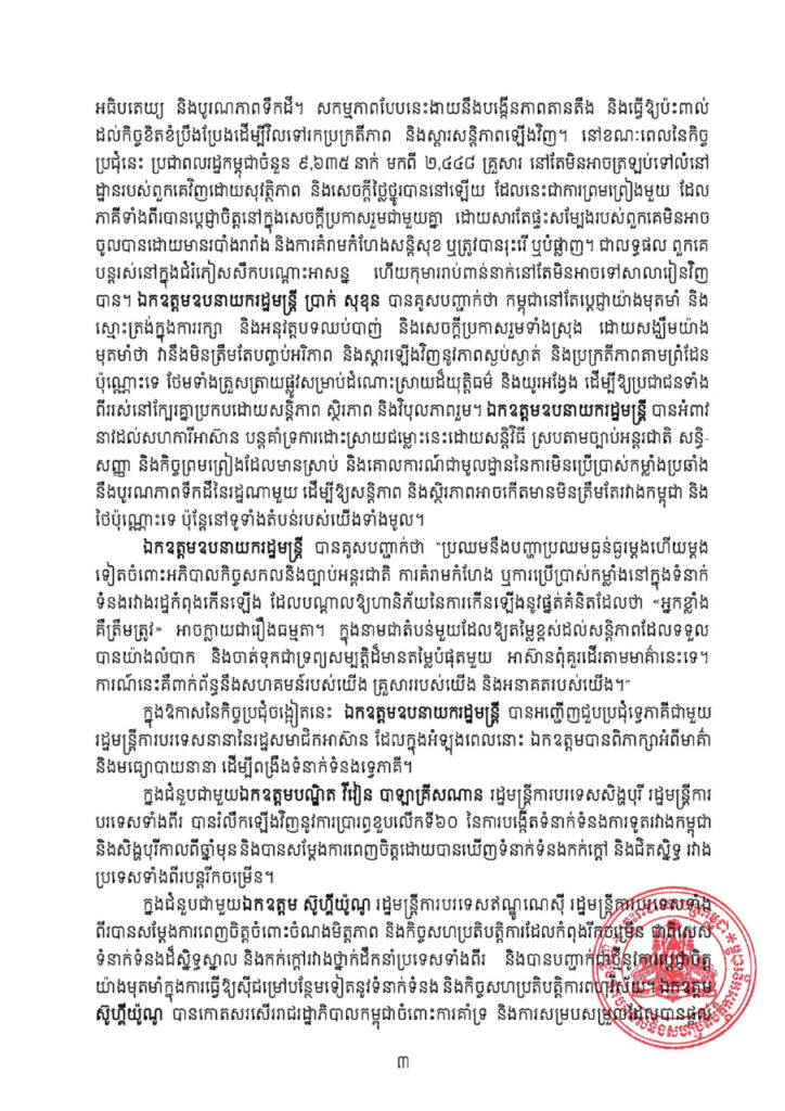 ឯកឧត្តមឧបនាយករដ្ឋមន្ត្រី បានសង្កត់ធ្ងន់ថា ទោះបីជាមានការរីកចម្រើនជាវិជ្ជមានចាប់តាំងពី មានបទឈប់បាញ់ក៏ដោយ ក៏នៅតែមានសកម្មភាពមួយចំនួនដែលមិនស្របនឹងសេចក្ដីប្រកាសរួមនៃកិច្ច ប្រជុំពិសេស លើកទី៣ របស់គណៈកម្មាធិការព្រំដែនទូទៅនេះ ជាពិសេសទាក់ទងនឹងការគោរព,អធិបតេយ្យ និងបូរណភាពទឹកដី។ សកម្មភាពបែបនេះងាយនឹងបង្កើនភាពតានតឹង និងធ្វើឱ្យប៉ះពាល់ ដល់កិច្ចខិតខំប្រឹងប្រែងដើម្បីវិលទៅរកប្រក្រតីភាព និងស្ដារសន្តិភាពឡើងវិញ។ នៅខណៈពេលនៃកិច្ច ប្រជុំនេះ ប្រជាពលរដ្ឋកម្ពុជាចំនួន ៩,៦៣៥ នាក់ មកពី ២,៤៤៨ គ្រួសារ នៅតែមិនអាចត្រឡប់ទៅលំនៅ ដ្ឋានរបស់ពួកគេវិញដោយសុវត្ថិភាព និងសេចក្ដីថ្លៃថ្នូរបាននៅឡើយ ដែលនេះជាការព្រមព្រៀងមួយ ដែល ភាគីទាំងពីរបានប្តេជ្ញាចិត្តនៅក្នុងសេចក្ដីប្រកាសរួមជាមួយគ្នា ដោយសារតែផ្ទះសម្បែងរបស់ពួកគេមិនអាច ចូលបានដោយមានរបាំងរារាំង និងការគំរាមកំហែងសន្តិសុខ ឬត្រូវបានរុះរើ ឬបំផ្លាញ។ ជាលទ្ធផល ពួកគ បន្តរស់នៅក្នុងជំរំភៀសសឹកបណ្តោះអាសន្ន ហើយកុមាររាប់ពាន់នាក់នៅតែមិនអាចទៅសាលារៀនវិញ បាន។ ឯកឧត្តមឧបនាយករដ្ឋមន្ត្រី ប្រាក់ សុខុន បានគូសបញ្ជាក់ថា កម្ពុជានៅតែប្តេជ្ញាយ៉ាងមុតមាំ និង ស្មោះត្រង់ក្នុងការរក្សា និងអនុវត្តបទឈប់បាញ់ និងសេចក្តីប្រកាសរួមទាំងស្រុង ដោយសង្ឃឹមយ៉ាង មុតមាំថា វានឹងមិនត្រឹមតែបញ្ចប់អរិភាព និងស្តារឡើងវិញនូវភាពស្ងប់ស្ងាត់ និងប្រក្រតីភាពតាមព្រំដែន ប៉ុណ្ណោះទេ ថែមទាំងត្រួសត្រាយផ្លូវសម្រាប់ដំណោះស្រាយដ៏យុត្តិធម៌ និងយូរអង្វែង ដើម្បីឱ្យប្រជាជនទាំង ពីររស់នៅក្បែរគ្នាប្រកបដោយសន្តិភាព ស្ថិរភាព និងវិបុលភាពរួម។ ឯកឧត្តមឧបនាយករដ្ឋមន្ត្រី បានអំពាវ នាវដល់សហការីអាស៊ាន បន្តគាំទ្រការដោះស្រាយជម្លោះនេះដោយសន្តិវិធី ស្របតាមច្បាប់អន្តរជាតិ សន្ធិ- សញ្ញា និងកិច្ចព្រមព្រៀងដែលមានស្រាប់ និងគោលការណ៍ជាមូលដ្ឋាននៃការមិនប្រើប្រាស់កម្លាំងប្រឆាំង នឹងបូរណភាពទឹកដីនៃរដ្ឋណាមួយ ដើម្បីឱ្យសន្តិភាព និងស្ថិរភាពអាចកើតមានមិនត្រឹមតែរវាងកម្ពុជា និង ថៃប៉ុណ្ណោះទេ ប៉ុន្តែនៅទូទាំងតំបន់របស់យើងទាំងមូល។