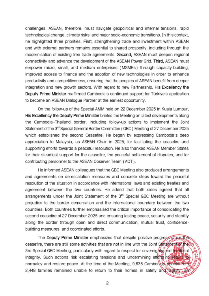 អំពីការតាមដានវឌ្ឍនភាពនៃកិច្ចប្រជុំពិសេសរដ្ឋមន្ត្រីការបរទេសអាស៊ាន ដែលបានប្រព្រឹត្តទៅ នៅថ្ងៃទី២២ ខែធ្នូ ឆ្នាំ២០២៥ នៅទីក្រុងគូឡាឡាំពួ ឯកឧត្ដមឧបនាយករដ្ឋមន្ត្រី បានជម្រាបជូនកិច្ចប្រជុំ ពីការវិវត្តថ្មីៗតាមបណ្ដោយព្រំដែនកម្ពុជា-ថៃ រួមទាំងសកម្មភាពតាមដាននានាដើម្បីអនុវត្តសេចក្តីប្រកាស រួមនៃកិច្ចប្រជុំពិសេសលើកទី៣ របស់គណៈកម្មាធិការព្រំដែនទូទៅ (GBC) នៅថ្ងៃទី២៧ ខែធ្នូ ឆ្នាំ ២០២៥ ដែលបានបង្កើតឱ្យមានបទឈប់បាញ់ជាលើកទីពីរ។ ឯកឧត្ដមឧបនាយករដ្ឋមន្ត្រី បានសម្តែងនូវអំណរ គុណយ៉ាងជ្រាលជ្រៅរបស់កម្ពុជាចំពោះប្រទេសម៉ាឡេស៊ី ក្នុងនាមជាប្រធានអាស៊ានឆ្នាំ២០២៥ សម្រាប់ ការសម្របសម្រួលបទឈប់បាញ់ និងគាំទ្រដល់កិច្ចខិតខំប្រឹងប្រែងនានាឆ្ពោះទៅរកដំណោះស្រាយដោយ សន្តិវិធី។ ឯកឧត្តមឧបនាយករដ្ឋមន្ត្រី ក៏បានថ្លែងអំណរគុណដល់រដ្ឋសមាជិកអាស៊ាននានាសម្រាប់ការគាំ ទ្រឥតងាករេចំពោះបទឈប់បាញ់ ការដោះស្រាយជម្លោះដោយសន្តិវិធី និងការរួមចំណែកបញ្ជូនកង កម្លាំងមកចូលរួមក្នុងក្រុមអ្នកសង្កេតការណ៍អាស៊ាន (AOT)។