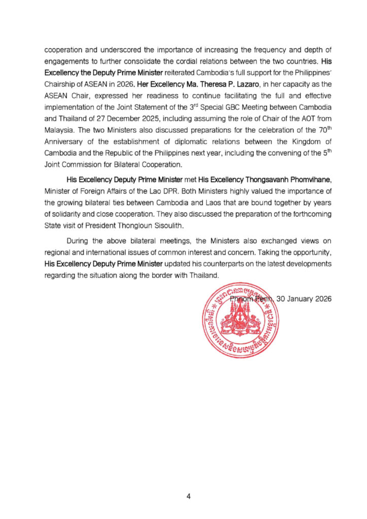 ក្នុងជំនួបជាមួយលោកជំទាវ ម៉ា តេរ៉េសា ភី ឡាហ្សារ៉ូ រដ្ឋមន្ត្រីការបរទេសហ្វីលីពីន រដ្ឋមន្ត្រីការ បរទេសទាំងពីរបានពិភាក្សាគ្នាលើវិស័យសហប្រតិបត្តិការជាច្រើន និងបានគូសបញ្ជាក់ពីសារៈសំខាន់ន ការបង្កើនចំនួន និងភាពស៊ីជម្រៅនៃការប្រាស្រ័យទាក់ទង ដើម្បីពង្រឹងបន្ថែមទៀតនូវទំនាក់ទំនងជិតស្និទ្ធ រវាងប្រទេសទាំងពីរ។ ឯកឧត្តមឧបនាយករដ្ឋមន្ត្រី បានបញ្ជាក់ជាថ្មីអំពីការគាំទ្រយ៉ាងពេញទំហឹងរបស់ កម្ពុជាចំពោះភាពជាប្រធានអាស៊ានរបស់ប្រទេសហ្វីលីពីននៅឆ្នាំ២០២៦នេះ ក្នុងនាមជាប្រធានអាស៊ាន លោកជំទាវ ម៉ តេរ៉េសា ភី ឡាហ្សារ៉ូ បានបង្ហាញពីការត្រៀមខ្លួនរួចជាស្រេចក្នុងការបន្តសម្របសម្រួលការ អនុវត្តពេញលេញ និងប្រកបដោយប្រសិទ្ធភាព នៃសេចក្តីប្រកាសរួម នៃកិច្ចប្រជុំពិសេសលើកទី៣ របស់ គណៈកម្មាធិការព្រំដែនទូទៅ រវាងកម្ពុជា និងថៃ នៅថ្ងៃទី២៧ ខែធ្នូ ឆ្នាំ២០២៥ . រួមទាំងការទទួលតួនាទី ជាប្រធានក្រុមអ្នកសង្កេតការណ៍អាស៊ាន (AOT) ពីប្រទេសម៉ាឡេស៊ី។ រដ្ឋមន្ត្រីការបរទេសទាំងពីរ ក៏បាន ពិភាក្សាអំពីការរៀបចំសម្រាប់ការប្រារព្ធខួបលើកទី៧០ នៃការបង្កើតទំនាក់ទំនងការទូតរវាងព្រះរាជាណា-ចក្រកម្ពុជា និងសាធារណរដ្ឋហ្វីលីពីន នៅឆ្នាំក្រោយ រួមទាំងការរៀបចំកិច្ចប្រជុំលើកទី៥ នៃគណៈកម្មការចម្រុះ ស្ដីពីកិច្ចសហប្រតិបត្តិការទ្វេភាគី។