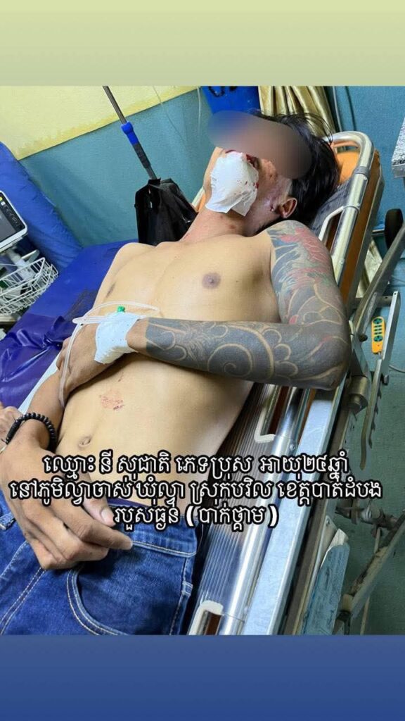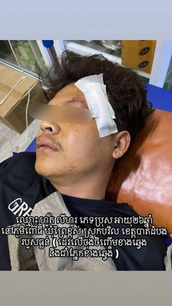 (៣)-ឈ្មោះ ធាម ប៊ុនធឿន ភេទប្រុស អាយុ២០ឆ្នាំ នៅភូមិព្រៃនឹល ឃុំព្រៃតូច ស្រុកមោងឬស្សី ខេត្តបាត់ដំបង.របួសស្រាសរលាតថ្ងាស ហើមចុងភ្នែកខាងស្ដាំនិងហើមដៃស្ដាំ ប្រេីទីបដែក