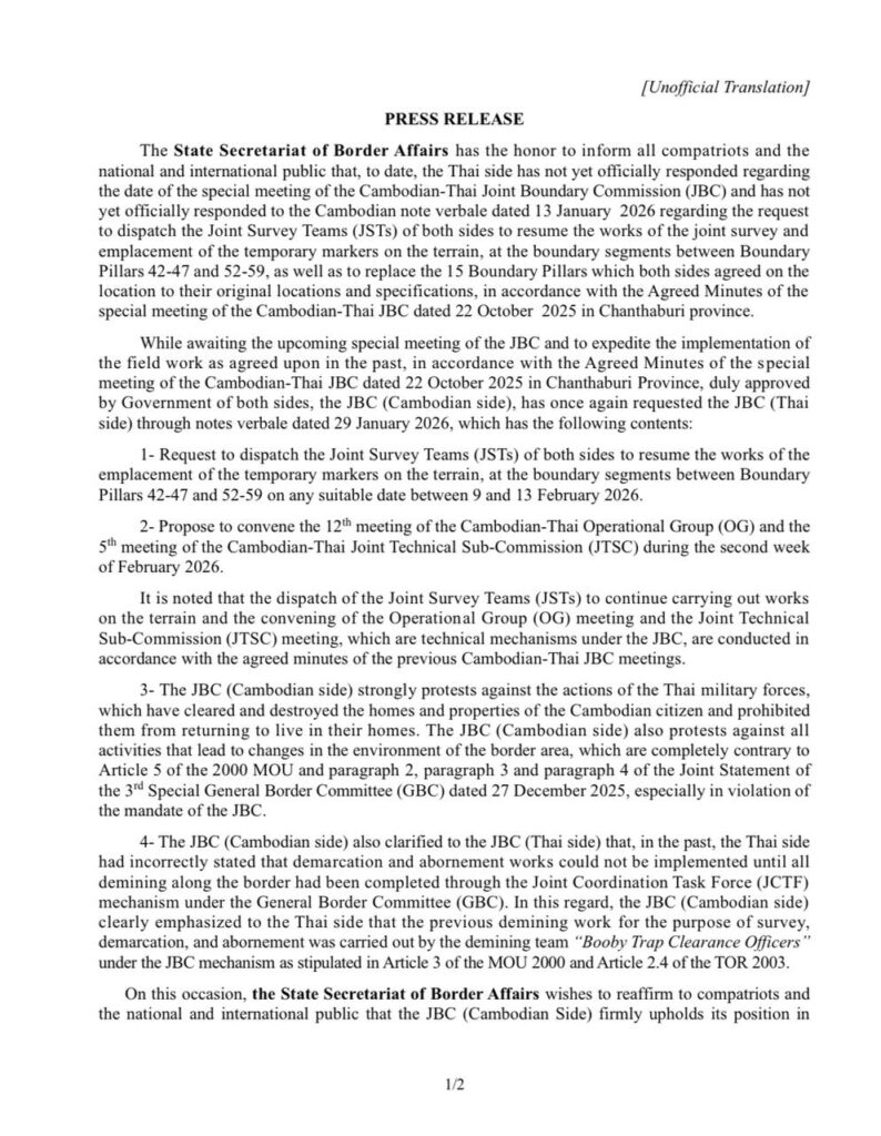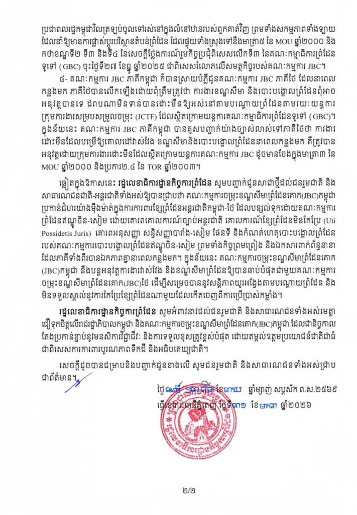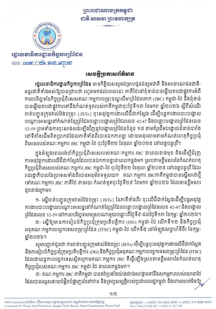 រដ្ឋលេខាធិការដ្ឋានកិច្ចការព្រំដែន មានកិត្តិយសសូមជម្រាបជូនជនរួមជាតិ និងសាធារណជនជាតិ- អន្ដរជាតិទាំងអស់ឱ្យបានជ្រាបថា រហូតមកដល់ពេលនេះ ភាគីថៃនៅពុំទាន់បានឆ្លើយតបជាផ្លូវការអំពី កាលបរិច្ឆេទនៃកិច្ចប្រជុំពិសេសគណៈកម្មការចម្រុះខណ្ឌសីមាព្រំដែនគោក (JBC) កម្ពុជា-ថៃ នឹងពុំទាន់ បានឆ្លើយតបជាផ្លូវការទៅនឹងកំណត់ទូតរបស់ភាគីកម្ពុជាចុះថ្ងៃទី១៣ ខែមករា ឆ្នាំ២០២៦ ស្តីពីសំណើ ចាត់បញ្ជូនក្រុមវាស់វែងចម្រុះ (JSTs) ចុះអនុវត្តការងារលើដីជាក់ស្ដែង ដើម្បីបន្តការងារបោះបង្គោល បណ្តោះអាសន្ននៅកំណាត់ខ្សែព្រំដែនចន្លោះបង្គោលព្រំដែនលេខ 42-47 និងចន្លោះបង្គោលព្រំដែនលេខ 52-59 ព្រមទាំងការចុះសាងសង់ឡើងវិញនូវបង្គោលព្រំដែនចំនួន ១៥ តាមគំរូដើមបង្គោលជំនាន់បារាំង នៅទីតាំងដើមពិតប្រាកដដែលភាគីទាំងពីរបានឯកភាពគ្នា ដោយអនុលោមតាមកំណត់ហេតុកិច្ចប្រជុំ ពិសេសរបស់គណៈកម្មការ JBC កម្ពុជា-ថៃ ចុះថ្ងៃទី២២ ខែតុលា ឆ្នាំ២០២៥ នៅខេត្តចន្ទបុរី។