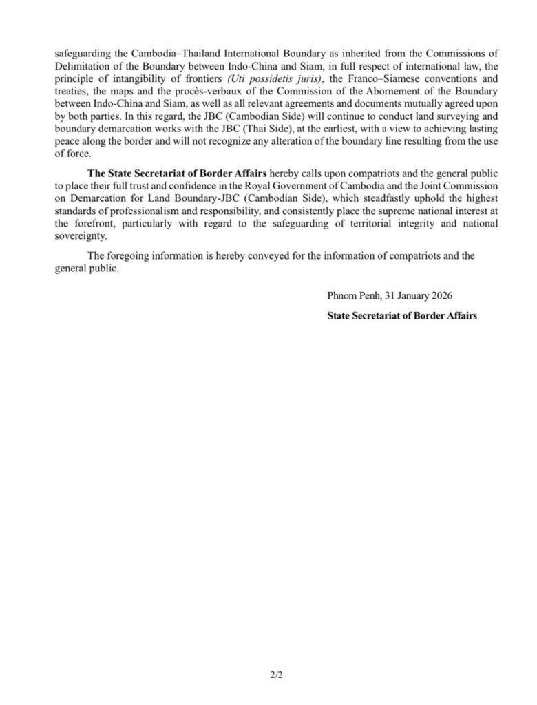 ឆ្លៀតក្នុងឱកាសនេះ រដ្ឋលេខាធិការដ្ឋានកិច្ចការព្រំដែន សូមបញ្ជាក់ជូនសាជាថ្មីដល់ជនរួមជាតិ និង សាធារណជនជាតិ-អន្តរជាតិទាំងអស់ឱ្យបានជ្រាបថា គណៈកម្មការចម្រុះខណ្ឌសីមាព្រំដែនគោក(JBC)កម្ពុជា ប្រកាន់ជំហរយ៉ាងម៉ឺងម៉ាត់ក្នុងការការពារខ្សែព្រំដែនអន្តរជាតិកម្ពុជា-ថៃ ដែលបន្សល់ទុកដោយគណៈកម្មការ ព្រំដែនឥណ្ឌូចិន-សៀម ដោយគោរពគោលការណ៍ច្បាប់អន្តរជាតិ គោលការណ៍ខ្សែព្រំដែនមិនកែប្រែ (Uti Possidetis Juris) គោរពអនុសញ្ញា សន្ធិសញ្ញាបារាំង-សៀម ផែនទី និងកំណត់ហេតុបោះបង្គោលព្រំដែន របស់គណៈកម្មការបោះបង្គោលព្រំដែនឥណ្ឌូចិន-សៀម ព្រមទាំងកិច្ចព្រមព្រៀង និងឯកសារពាក់ព័ន្ធនានា ដែលភាគីទាំងពីរបានឯកភាពគ្នានាពេលកន្លងមក។ ក្នុងន័យនេះ គណៈកម្មការចម្រុះខណ្ឌសីមាព្រំដែនគោក (JBC)កម្ពុជា នឹងបន្តអនុវត្តការងារវាស់វែង និងខណ្ឌសីមាព្រំដែនឱ្យបានឆាប់បំផុតជាមួយគណៈកម្មការ ចម្រុះខណ្ឌសីមាព្រំដែនគោក(JBC)ថៃ ដើម្បីសម្រេចបាននូវសន្តិភាពយូរអង្វែងតាមបណ្ដោយព្រំដែន និង