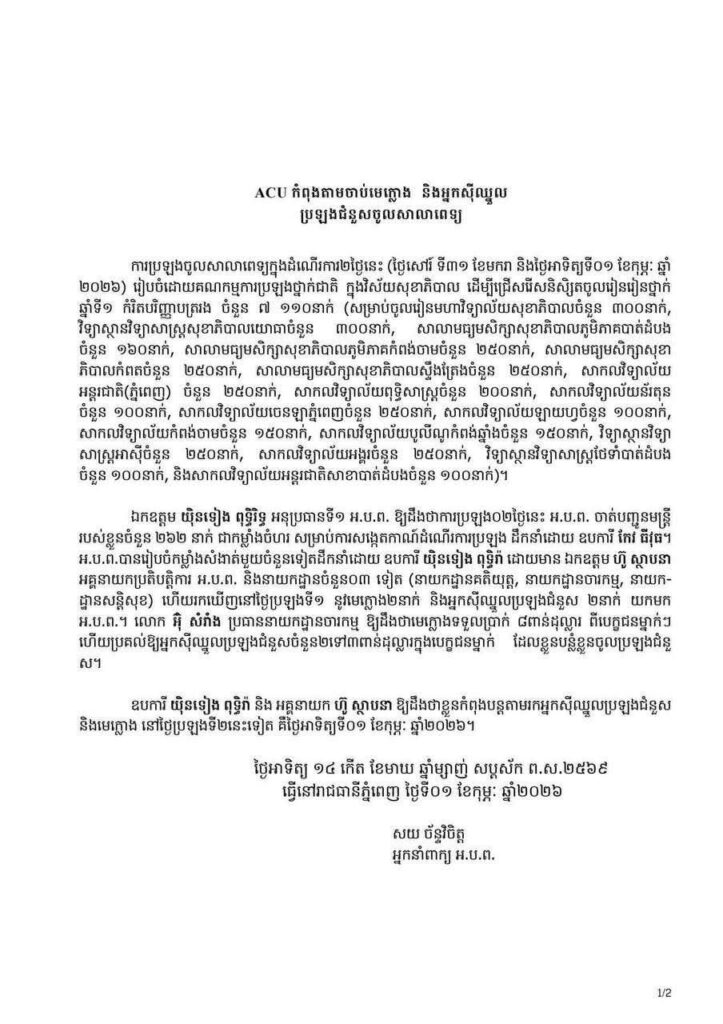 នៅថ្ងៃអាទិត្យ ទី០១ ខែកុម្ភៈ ឆ្នាំ២០២៦ លោកសយ ច័ន្ទវិចិត្ត អ្នកនាំពាក្យ អ.ប.ព.បានថ្លែងថា ការប្រឡងចូលសាលាពេទ្យក្នុងដំណើរការ២ថ្ងៃនេះ (ថ្ងៃសៅរ៍ ទី៣១ ខែមករា និងថ្ងៃអាទិត្យទី០១ ខែកុម្ភៈ ឆ្នាំ ២០២៦) រៀបចំដោយគណកម្មការប្រឡងថ្នាក់ជាតិ ក្នុងវិស័យសុខាភិបាល ដើម្បីជ្រើសរើសនិសិ្សតចូលរៀនរៀនថ្នាក់ ឆ្នាំទី១ កំរិតបរិញ្ញាបត្ររង ចំនួន ៧ ១១០នាក់ (សម្រាប់ចូលរៀនមហាវិទ្យាល័យសុខាភិបាលចំនួន ៣០០នាក់, វិទ្យាស្ថានវិទ្យាសាស្ត្រសុខាភិបាលយោធាចំនួន ៣០០នាក់, សាលាមធ្យមសិក្សាសុខាភិបាលភូមិភាគបាត់ដំបង ចំនួន ១៦០នាក់ សាលាមធ្យមសិក្សាសុខាភិបាលភូមិភាគកំពង់ចាមចំនួន ២៥០នាក់, សាលាមធ្យមសិក្សាសុខា ភិបាលកំពតចំនួន ២៥០នាក់, សាលាមធ្យមសិក្សាសុខាភិបាលស្ទឹងត្រែងចំនួន ២៥០នាក់, សាកលវិទ្យាល័យ អន្តរជាតិ(ភ្នំពេញ) ចំនួន ២៥០នាក់, សាកលវិទ្យាល័យពុទ្ធិសាស្ត្រចំនួន ២០០នាក់, សាកលវិទ្យាល័យន័រតុន ចំនួន ១០០នាក់, សាកលវិទ្យាល័យចេនឡាភ្នំពេញចំនួន ២៥០នាក់, សាកលវិទ្យាល័យឡាយហ្វចំនួន ១០០នាក់, សាកលវិទ្យាល័យកំពង់ចាមចំនួន ១៥០នាក់, សាកលវិទ្យាល័យបូលីណូកំពង់ឆ្នាំងចំនួន ១៥០នាក់, វិទ្យាស្ថានវិទ្យា សាស្ត្រអាស៊ីចំនួន ២៥០នាក់, សាកលវិទ្យាល័យអង្គរចំនួន ២៥០នាក់, វិទ្យាស្ថានវិទ្យាសាស្រ្តថែទាំបាត់ដំបង ចំនួន ១០០នាក់, និងសាកលវិទ្យាល័យអន្តរជាតិសាខាបាត់ដំបងចំនួន ១០០នាក់)។
