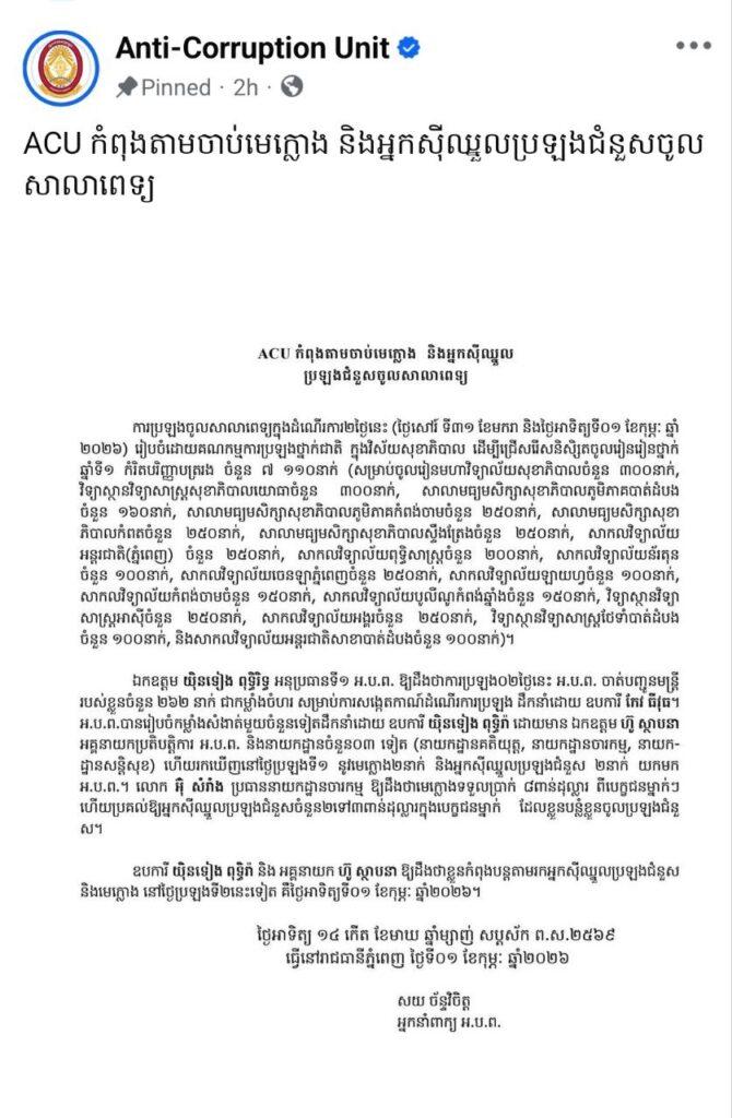 ភ្នំពេញ៖ អង្គភាពប្រឆាំងអំពើពុករលួយ (ACU) កំពុងតាមចាប់មេក្លោង និងអ្នកស៊ីឈ្នួលប្រឡងជំនួសចូលសាលាពេទ្យ។