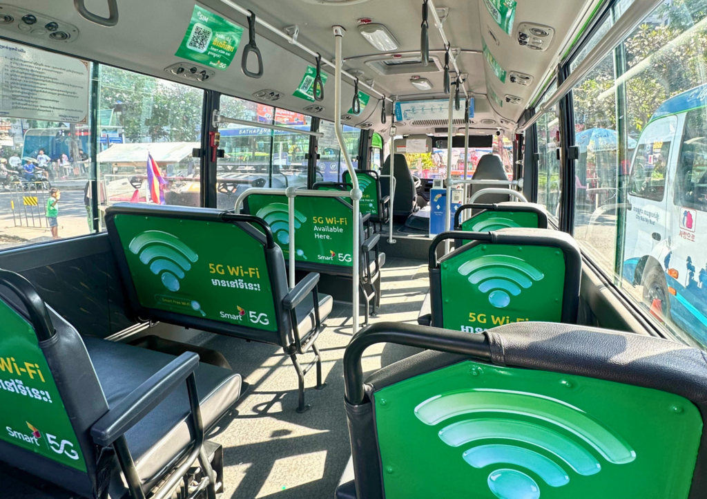 នៅពេលឡើងជិះលើរថយន្ត អ្នកដំណើរអាចរីករាយជាមួយនឹង WiFi ដែលដំណើរការដោយបច្ចេកវិទ្យា 5G ល្បឿនលឿន និងគួរឱ្យទុកចិត្តបំផុតរបស់ក្រុមហ៊ុន Smart នៅលើរថយន្តក្រុងទៅមក ពីអាកាសយានដ្ឋានអន្តរជាតិតេជោ។