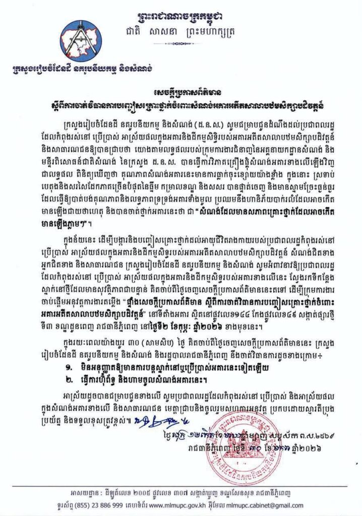 ក្នុងន័យនេះ ដើម្បីបង្ការនិងបញ្ចៀសគ្រោះថ្នាក់ដល់អាយុជីវិតរាងកាយរបស់ប្រជាពលរដ្ឋកំពុងរស់នៅ ប្រើប្រាស់ អាស្រ័យផលក្នុងអគារនិងដីកម្មសិទ្ធរបស់អគារអតីតសាលាបឋមសិក្សាបដិវត្តន៍ សំណង់ជិតខាង អ្នកជិតខាង និងសាធារណជន ក្រសួងរៀបចំដែនដី នគរូបនីយកម្ម និងសំណង់ សូមអំពាវនាវឱ្យប្រជាពលរដ្ឋ ដែលកំពុងរស់នៅ ប្រើប្រាស់ អាស្រ័យផលក្នុងអគារនិងដីកម្មសិទ្ធរបស់អគារខាងលើនេះ ស្វែងរកទីកន្លែង ស្នាក់នៅថ្មីដែលមានសុវត្ថិភាពជាបន្ទាន់ គិតចាប់ពីថ្ងៃចេញសេចក្តីប្រកាសព័ត៌មាននេះតទៅ ដើម្បីក្រុមការងារ ចាប់ផ្តើមអនុវត្តការងារតម្លើង “ផ្ទាំងសេចក្តីប្រកាសព័ត៌មាន ស្ដីពីការចាត់វិធានការបញ្ចៀសគ្រោះថ្នាក់ចំពោះ អគារអតីតសាលាបឋមសិក្សាបដិវត្តន៍” នៅទីតាំងអគារ ស្ថិតនៅផ្លូវលេខ១៤៤ កែងផ្លូវលេខ៤៩ សង្កាត់ផ្សារថ្មី ទី៣ ខណ្ឌដូនពេញ រាជធានីភ្នំពេញ នៅថ្ងៃទី២ ខែកុម្ភៈ ឆ្នាំ២០២៦ ខាងមុខនេះ។