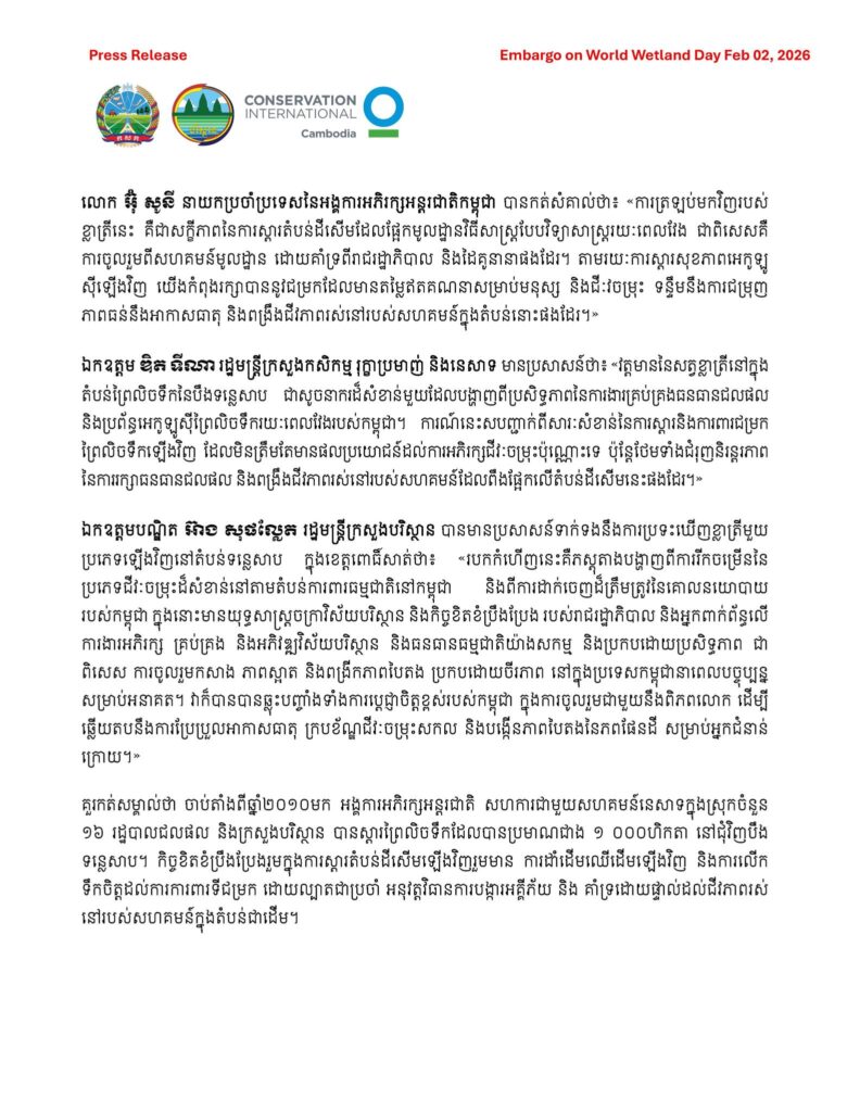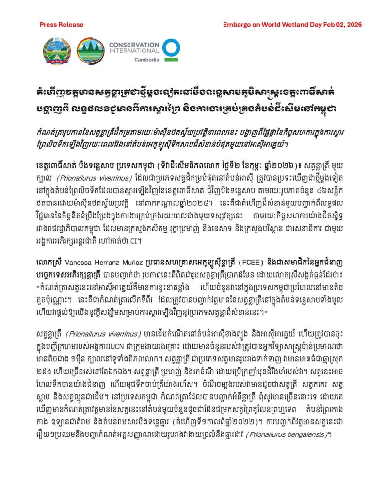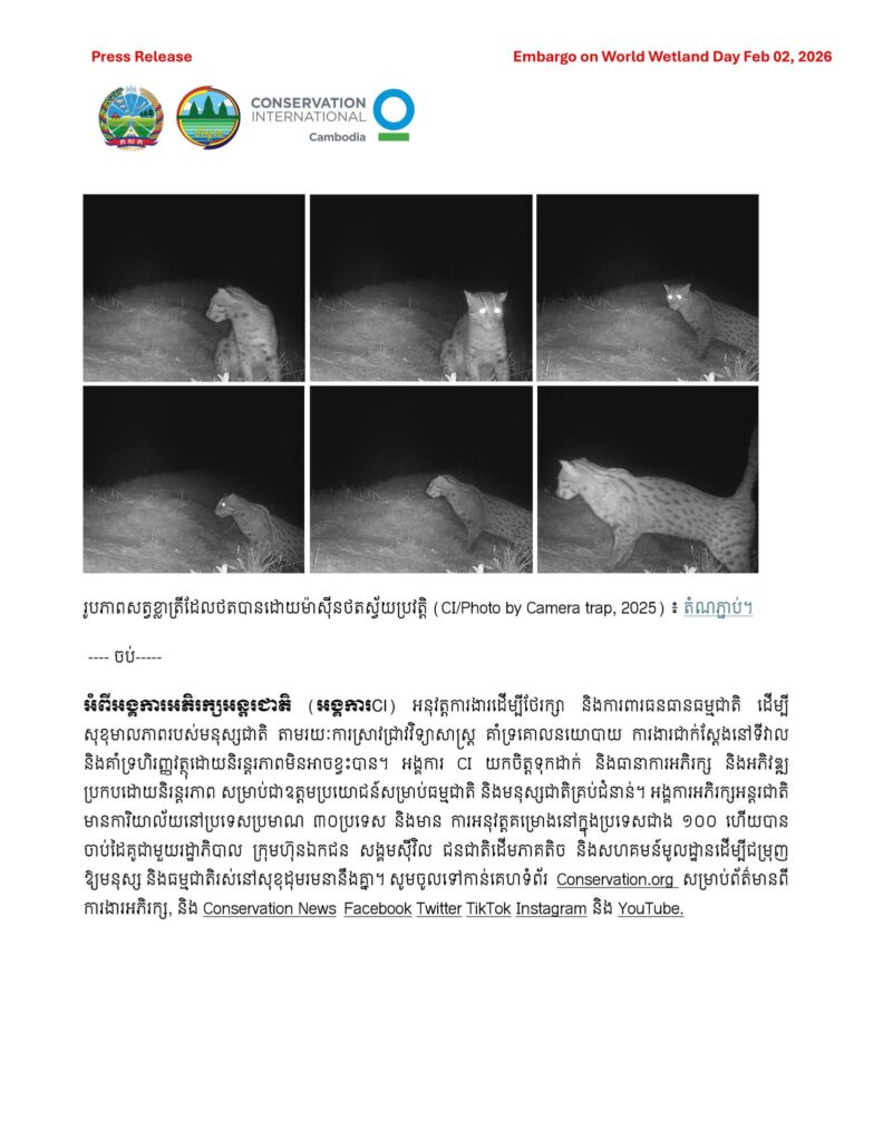 ខេត្តពោធិ៍សាត់ បឹងទន្លេសាប ប្រទេសកម្ពុជា (ទិវាដីសើមពិភពលោក ថ្ងៃទី២ ខែកុម្ភៈ ឆ្នាំ២០២៦)៖ សត្វខ្លាត្រី មួយក្បាល (Prionailurus viverrinus) ដែលជាប្រភេទសត្វដ៏កម្របំផុតនៅតំបន់អាស៊ី ត្រូវបានប្រទះឃើញជាថ្មីម្ដងទៀត នៅក្នុងតំបន់ព្រៃលិចទឹកដែលបានស្តារឡើងវិញនៃខេត្តពោធិ៍សាត់ ជុំវិញបឹងទន្លេសាប តាមរយៈរូបភាពចំនួន ៤៦សន្លឹក ថតបានដោយម៉ាស៊ីនថតស្វ័យប្រវត្តិ នៅពាក់កណ្ដាលឆ្នាំ២០២៥។ នេះគឺជាគំហើញដ៏សំខាន់មួយបញ្ជាក់ពីលទ្ធផល វិជ្ជមាននៃកិច្ចខិតខំប្រឹងប្រែងក្នុងការងារគ្រប់គ្រងរយៈពេលជាងមួយទស្សវត្សនេះ តាមរយៈកិច្ចសហការយ៉ាងជិតស្និទ្ធ រវាងរាជរដ្ឋាភិបាលកម្ពុជា ដែលមានក្រសួងកសិកម្ម រុក្ខាប្រមាញ់ និងនេសាទ និងក្រសួងបរិស្ថាន ជាសេនាធិការ ជាមួយ អង្គការអភិរក្សអន្តរជាតិ ហៅកាត់ថា CI។