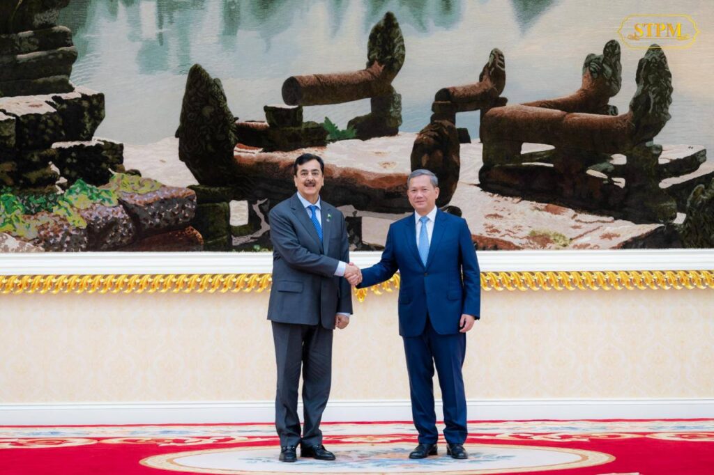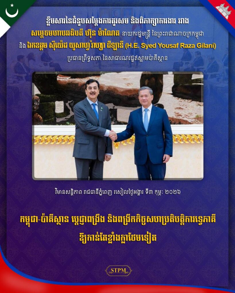 ភ្នំពេញ ៖ នារសៀលថ្ងៃទី០៣ ខែកុម្ភៈ ឆ្នាំ២០២៦, សម្តេចមហាបវរធិបតី ហ៊ុន ម៉ាណែត នាយករដ្ឋមន្រ្តី នៃព្រះរាជាណាចក្រកម្ពុជា បានទទួលជួបពិភាក្សាការងារជាមួយ ឯកឧត្តម ស៊ីយ៉េដ យូសាហ្វ រ៉ាហ្សា ជីឡានី (H.E. Syed Yousaf Raza Gilani) ប្រធានព្រឹទ្ធសភា នៃសាធារណរដ្ឋឥស្លាមប៉ាគីស្ថាន នៅវិមានសន្តិភាព ក្នុងឱកាសដែលឯកឧត្តមដឹកនាំគណៈប្រតិភូ អញ្ជើញបំពេញទស្សនកិច្ចផ្លូវការ នៅព្រះរាជាណាចក្រកម្ពុជា ពីថ្ងៃទី២ ដល់ថ្ងៃទី៥ ខែកុម្ភៈ ឆ្នាំ២០២៦ ។