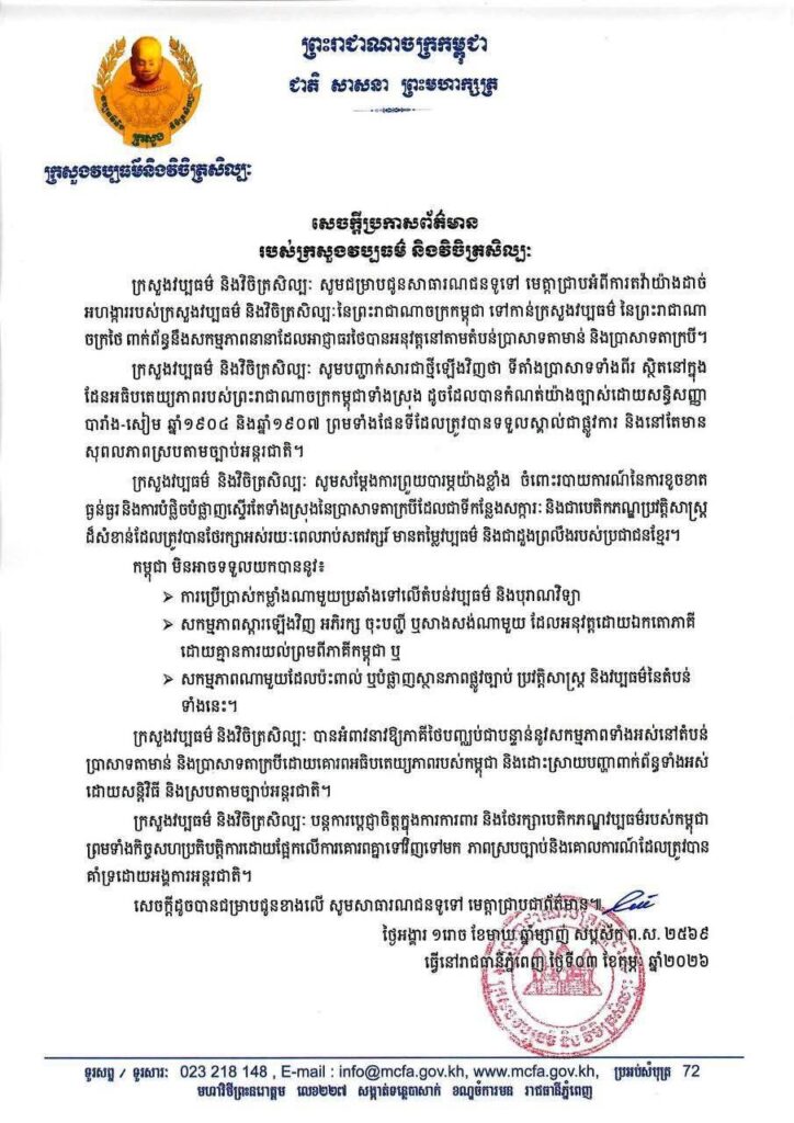 ក្រសួងវប្បធម៌ និងវិចិត្រសិល្បៈ បានអំពាវនាវឱ្យភាគីថៃបញ្ឈប់ជាបន្ទាន់នូវសកម្មភាពទាំងអស់នៅតំបន់ ប្រាសាទតាមាន់ និងប្រាសាទតាក្របីដោយគោរពអធិបតេយ្យភាពរបស់កម្ពុជា និងដោះស្រាយបញ្ហាពាក់ព័ន្ធទាំងអស់ ដោយសន្តិវិធី និងស្របតាមច្បាប់អន្តរជាតិ។