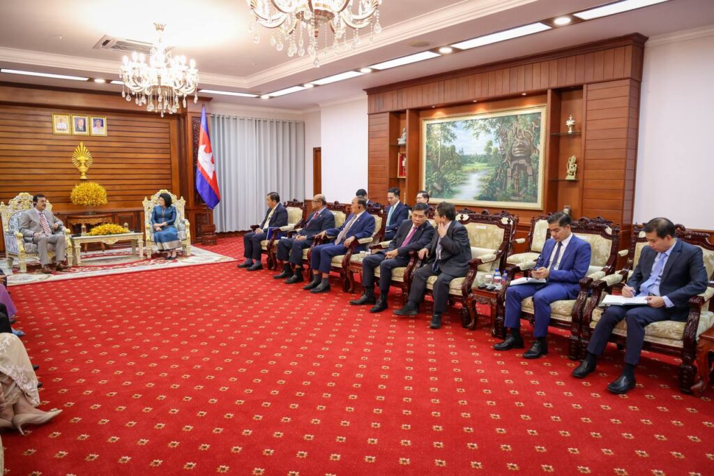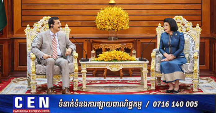 សម្ដេចរដ្ឋសភាធិបតី ឃួន សុដារី បានសម្ដែងនូវការស្វាគមន៍ដោយក្តីរីករាយចំពោះវត្តមានឯកឧត្តមប្រធានព្រឹទ្ធសភា និងបានចាត់ទុកវត្តមាន ឯកឧត្តមនៅកម្ពុជាជាផ្នែកដ៏សំខាន់ក្នុងការធ្វើឱ្យទំនាក់ទំនងរវាងប្រទេសទាំងពីរកាន់តែរីកចម្រើនបន្ថែមទៀត ទាំងក្នុងក្របខ័ណ្ឌស្ថាប័ននីតិប្បញ្ញត្តិ និងស្ថាប័ននីតិប្រតិបត្តិ។សម្តេចប្រធានរដ្ឋសភា បានអបអរសាទរចំពោះភាពជោគជ័យថ្មីៗនេះរបស់ប៉ាគីស្ថាន ដែលបានរៀបចំនូវសន្និសីទ ប្រធានសភានៃអន្តរសភា(ISC) កាលពីខែវិច្ឆិកាកន្លងទៅ ដែលសន្និសីទនេះក៏បានចេញសេចក្តីប្រកាសគំាទ្រចំពោះកិច្ចព្រមព្រៀងសន្តិភាពកម្ពុជា-ថៃ និងបានជំរុញឱ្យភាគីទំាងពីរ អនុវត្តកិច្ចព្រមព្រៀងនោះ ឱ្យមានប្រសិទ្ធភាពខ្ពស់ក្នុងការដោះស្រាយជម្លោះព្រំដែនរវាងគ្នា។