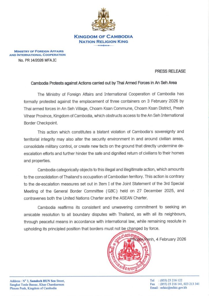 ក្រសួងការបរទេស និងសហប្រតិបត្តិការអន្តរជាតិ នៃប្រទេសកម្ពុជា សូមតវ៉ាជាផ្លូវការប្រឆាំងនឹង ការដាក់កុងតឺន័រចំនួនបី នៅថ្ងៃទី៣ ខែកុម្ភៈ ឆ្នាំ២០២៦ ដោយកងកម្លាំងប្រដាប់អាវុធថៃ នៅក្នុងភូមិអានសេះ ឃុំជាំក្សាន្ត ស្រុកជាំក្សាន្ត ខេត្តព្រះវិហារ នៃព្រះរាជាណាចក្រកម្ពុជា ដែលរារាំងដល់ការចូលទៅកាន់ច្រកព្រំដែន អន្តរជាតិអានសេះ។