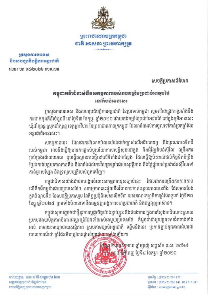 កម្ពុជាជំទាស់យ៉ាងដាច់អហង្ការចំពោះសកម្មភាពខុសច្បាប់នេះ ដែលជាការពង្រឹងការកាន់កាប់ លើទឹកដីកម្ពុជាដោយប្រទេសថៃ។