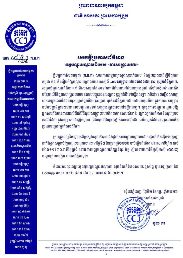 ភ្នំពេញ ៖ ក្លិបអ្នកកាសែតកម្ពុជា សហការជាមួយក្រសួងសុខាភិបាល និងផ្ទះយុវជនដើម្បីមិត្តភាពកម្ពុជា-ចិន រៀបចំវគ្គបណ្តុះបណ្តាលពិសេសស្តីពី «ការសង្គ្រោះបឋមដល់ជនរងគ្រោះ ឬអ្នកជំងឺភ្លាមៗ» នៅថ្ងៃទី៥ ខែកុម្ភៈ ឆ្នាំ២០២៦ ។