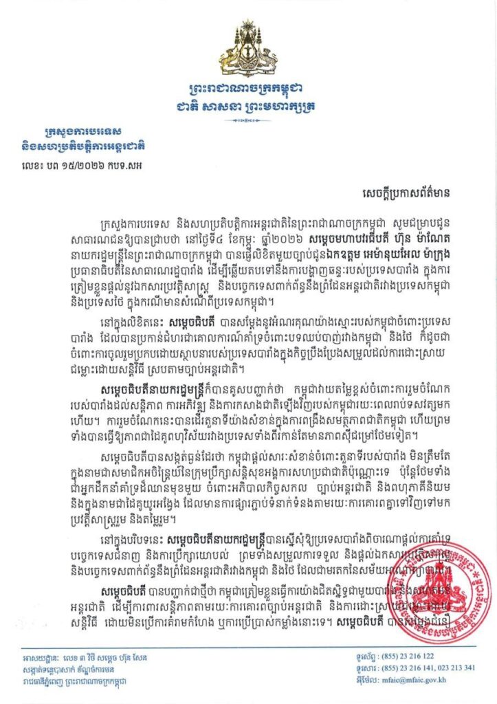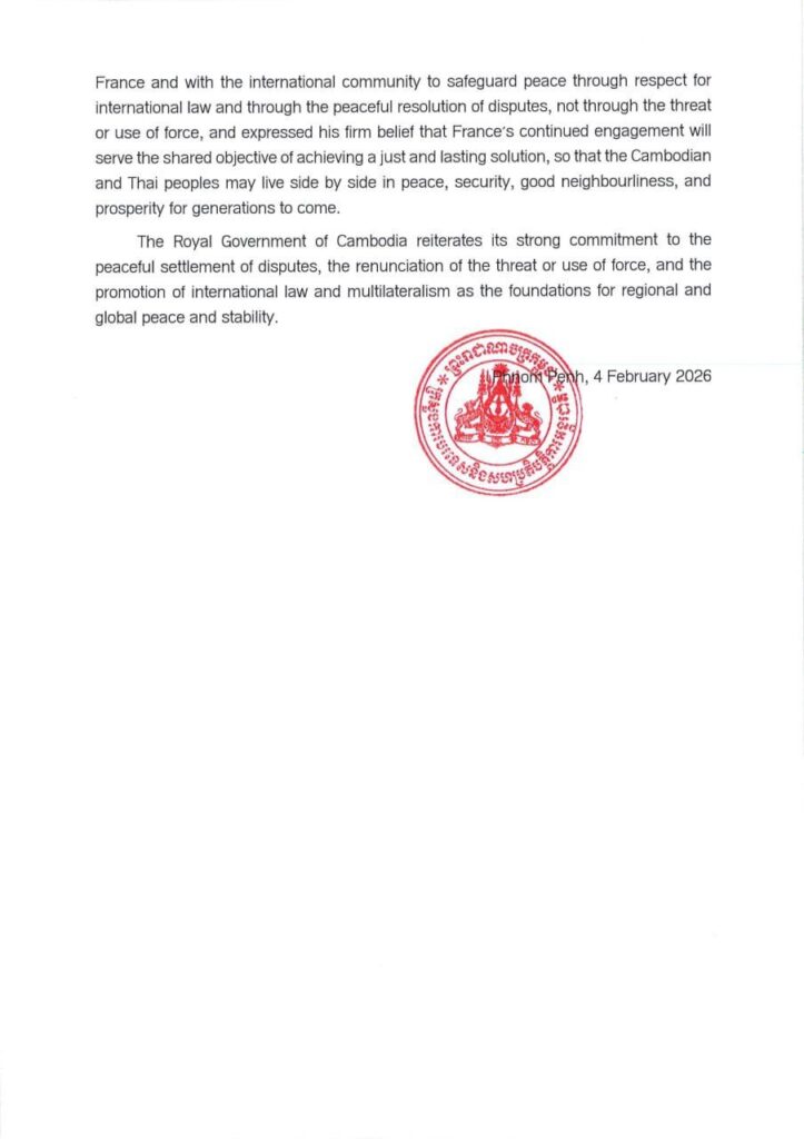 ក្រសួងការបរទេស និងសហប្រតិបត្តិការអន្តរជាតិនៃព្រះរាជាណាចក្រកម្ពុជា សូមជម្រាបជូន សាធារណជនឱ្យបានជ្រាបថា នៅថ្ងៃទី៤ ខែកុម្ភៈ ឆ្នាំ២០២៦ សម្តេចមហាបវរធីបតី ហ៊ុន ម៉ាណែត នាយករដ្ឋមន្ត្រីនៃព្រះរាជាណាចក្រកម្ពុជា បានផ្ញើលិខិតមួយច្បាប់ជូនឯកឧត្តម អេម៉ានុយអែល ម៉ាក្រុង ប្រធានាធិបតីនៃសាធារណរដ្ឋបារាំង ដើម្បីឆ្លើយតបទៅនឹងការបង្ហាញឆន្ទៈរបស់ប្រទេសបារាំង ក្នុងការ ត្រៀមខ្លួនផ្តល់នូវឯកសារប្រវត្តិសាស្ត្រ និងបច្ចេកទេសពាក់ព័ន្ធនឹងព្រំដែនអន្តរជាតិរវាងប្រទេសកម្ពុជា និងប្រទេសថៃ ក្នុងករណីមានសំណើពីប្រទេសកម្ពុជា។