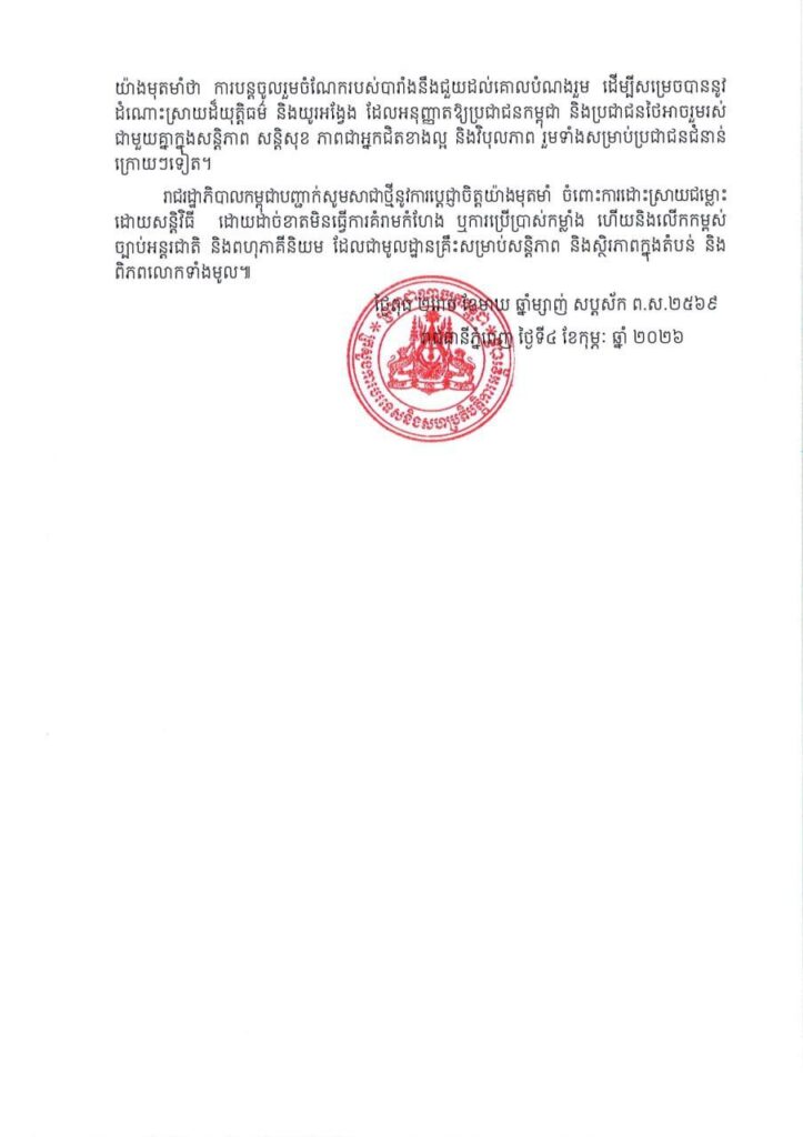 រាជរដ្ឋាភិបាលកម្ពុជាបញ្ជាក់សូមសាជាថ្មីនូវការប្ដេជ្ញាចិត្តយ៉ាងមុតមាំ ចំពោះការដោះស្រាយជម្លោះ ដោយសន្តិវិធី ដោយដាច់ខាតមិនធ្វើការគំរាមកំហែង ឬការប្រើប្រាស់កម្លាំង ហើយនិងលើកកម្ពស់ ច្បាប់អន្តរជាតិ និងពហុភាគីនិយម ដែលជាមូលដ្ឋានគ្រឹះសម្រាប់សន្តិភាព និងស្ថិរភាពក្នុងតំបន់ និង ពិភពលោកទាំងមូល៕ រក្សាសិទ្ធដោយ៖សុទ្ធលី