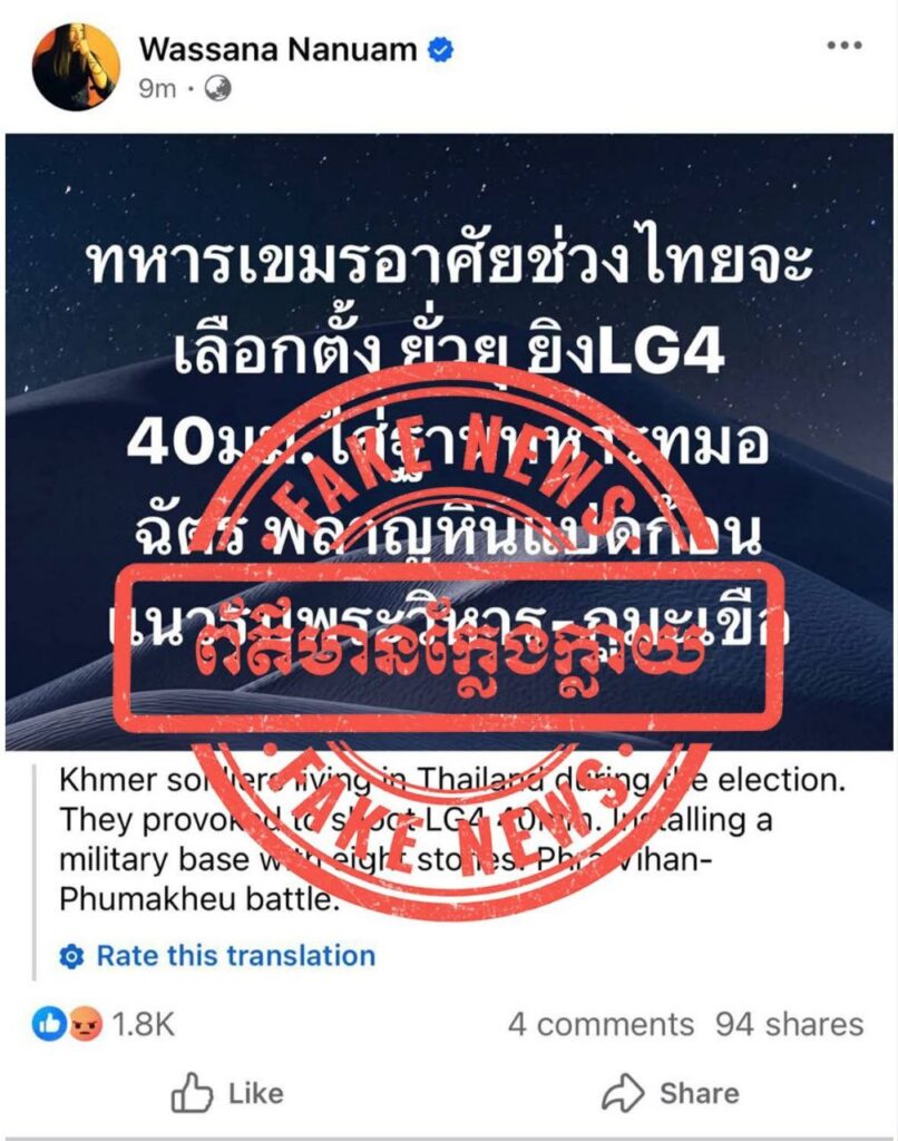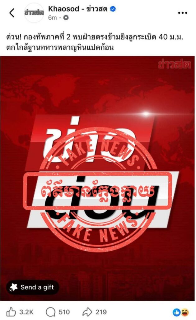 អ្នកនាំពាក្យក្រសួងការពារជាតិ នៃព្រះរាជាណាចក្រកម្ពុជា សូមធ្វើការបដិសេធចោលទាំងស្រុងនូវការចុះផ្សាយរបស់បណ្តាញសារព័ត៌មានថៃខាងលើ និងសូមអះអាងថាជាព័ត៌មានប្រឌិត ក្លែងក្លាយផ្ទុយពីការពិតទាំងស្រុង ក្នុងគោលបំណងបំភាន់ដល់សាធារណមតិ និងធ្វើឱ្យស្ថានការណ៍នៅតាមបណ្តោយព្រំដែនកម្ពុជា-ថៃ មានភាពតានតឹង។