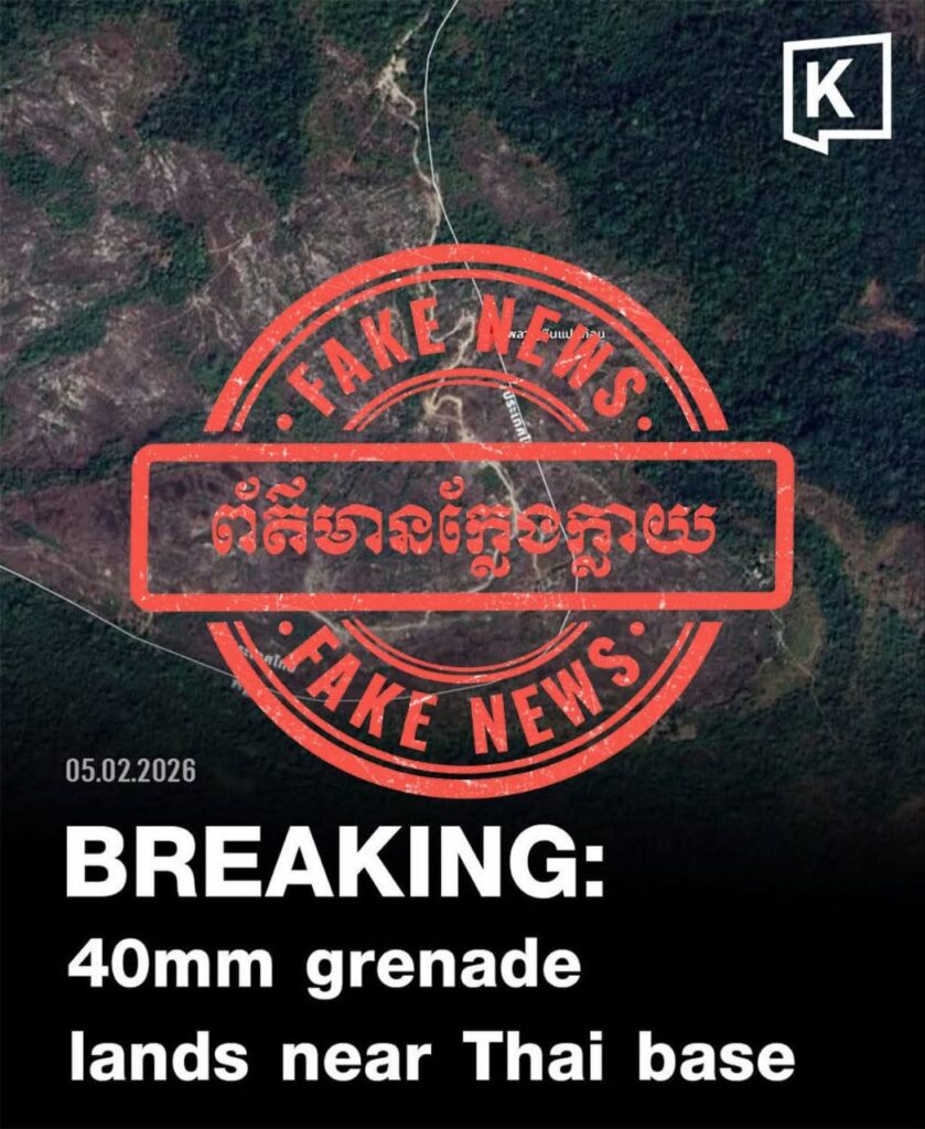 ភ្នំពេញ ៖ លោកជំទាវ ឧត្តមសេនីយ៍ឯក ម៉ាលី សុជាតា អ្នកនាំពាក្យក្រសួងការពារជាតិ នៃព្រះរាជាណាចក្រកម្ពុជា នៅថ្ងៃព្រហស្បតិ៍ ៣រោច ខែមាឃ ឆ្នាំម្សាញ់ សប្តស័ក ព.ស ២៥៦៩ ត្រូវនឹងថ្ងៃទី៥ ខែកុម្ភៈ ឆ្នាំ២០២៦ បានចេញសេចក្តីប្រកាសព័ត៌មានសូមជម្រាបជូនសាធារណជន អ្នកសារព័ត៌មានជាតិ និងអន្តរជាតិមេត្តាជ្រាបថា៖ នៅថ្ងៃទី៥ ខែកុម្ភៈ ឆ្នាំ២០២៦នេះ មានបណ្តាញសារព័ត៌មានថៃមួយចំនួនបានផ្សព្វផ្សាយថា « បន្ទាន់! កងទ័ពភូមិភាគទី២ បានរកឃើញថា ភាគីម្ខាងទៀតបានបាញ់គ្រាប់បែក ៤០មីលីម៉ែត្រ ធ្លាក់នៅក្បែរមូលដ្ឋានទាហាន Phlan Hin Pet Kon។»។