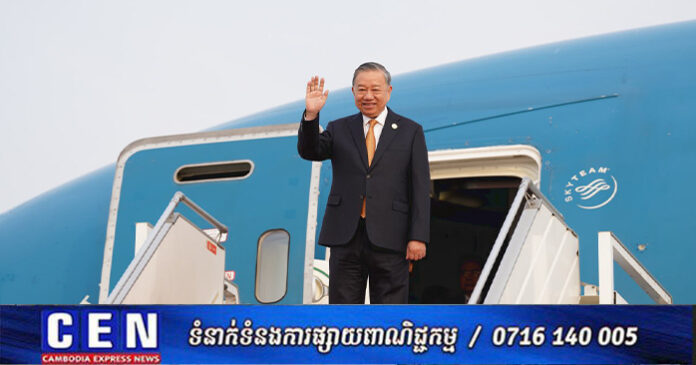 ភ្នំពេញ ៖ នៅព្រឹកថ្ងៃសុក្រ ទី៦ ខែកុម្ភៈ ឆ្នាំ២០២៦នេះ លោក តូ ឡឹម អគ្គលេខាធិការបក្សកុម្មុយនីស្តវៀតណាម ដែលជាឥស្សរជនដ៏មានឥទ្ធិពលរបស់វៀតណាម នាពេលបច្ចុប្បន្ន បានអញ្ជើញមកដល់ប្រទេសកម្ពុជាហើយ ដើម្បីបំពេញទស្សនកិច្ចផ្លូវរដ្ឋរយៈពេលមួយថ្ងៃ។