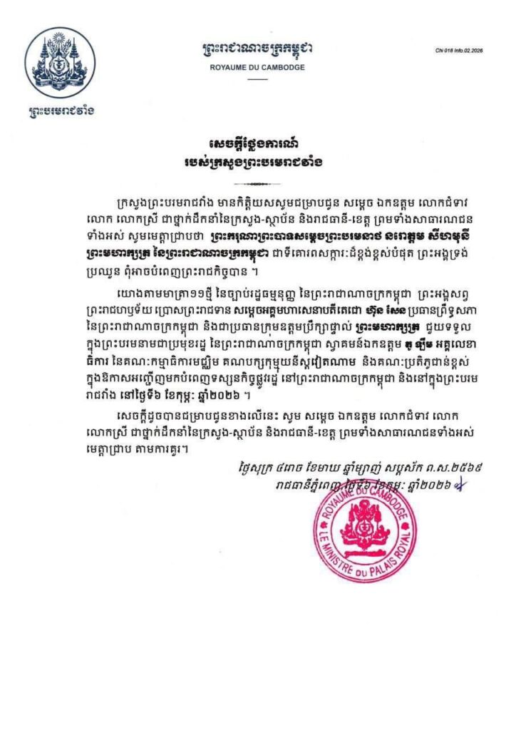 ក្រសួងព្រះបរមរាជវាំង នៅព្រឹកថ្ងៃទី៦ ខែកុម្ភៈ ឆ្នាំ២០២៦នេះ បានចេញសេចក្តីថ្លែងការណ៍ដោយបញ្ជាក់ថា ព្រះមហាក្សត្រកម្ពុជា ព្រះអង្គទ្រង់ប្រឈួន ពុំអាចបំពេញព្រះរាជកិច្ចបាន ប្រគល់ភារកិច្ចជូនសម្តេចតេជោ ហ៊ុន សែន ជាប្រមុខរដ្ឋស្តីទី ឱ្យទទួលស្វាគមន៍លោក តូ ឡឹម នៅក្នុងព្រះបរមរាជវាំង។