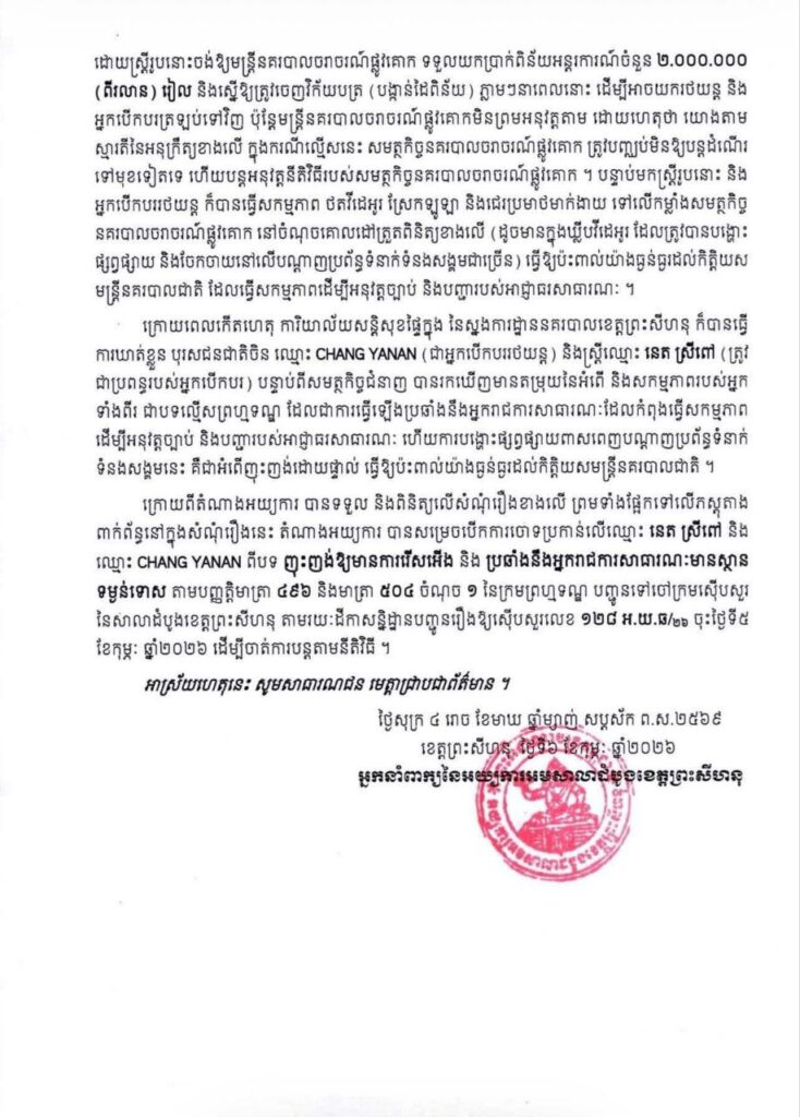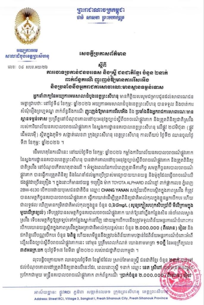 ដើមហេតុនៃករណីនេះ នៅយប់ថ្ងៃទី២ ខែកុម្ភៈ ឆ្នាំ២០២៦ កម្លាំងការិយាល័យនគរបាលចរាចរណ៍ផ្លូវគោក នៃស្នងការដ្ឋាននគរបាលខេត្តព្រះសីហនុ បានដាក់គោលដៅចុះអនុវត្តច្បាប់ស្តីពីចរាចរណ៍ផ្លូវគោក និងត្រួតពិនិត្យ ជាតិស្រវឹង នៅចំណុចកើតហេតុខាងលើ ។ អំឡុងពេលនៃការបំពេញតួនាទីភារកិច្ច សមត្ថកិច្ចនគរបាលចរាចរណ៍ ផ្លូវគោក បានធ្វើការត្រួតពិនិត្យ និងណែនាំដល់អ្នកប្រើប្រាស់មធ្យោបាយយានយន្ត និងម៉ូតូដែលធ្វើចរាចរណ៍លើ ដងផ្លូវជាច្រើនគ្រឿង ។ ក្នុងនោះក៏មានរថយន្ត ១គ្រឿង ម៉ាក TOYOTA ALPHARD ពណ៌ខ្មៅ ពាក់ផ្លាកលេខ ភ្នំពេញ 2BW-6130 បើកបរដោយបុរសជនជាតិចិន ឈ្មោះ CHANG YANAN សង្ស័យបើកបរស្ថិតក្នុងភាពស្រវឹង ក៏ត្រូវ បានសមត្ថកិច្ចនគរបាលចរាចរណ៍ផ្លូវគោក ធ្វើការឃាត់ដើម្បីត្រួតពិនិត្យជាតិអាល់កុលក្នុងខ្លួនអ្នកបើកបរ ហើយ ជាលទ្ធផល ឃើញមានកម្រិតជាតិអាល់កុលក្នុងខ្លួន ចំនួន ០,៦៨mg/L (សូន្យក្បៀសហុកសិបប្រាំបី មីលីក្រាមក្នុង មួយលីត្រខ្យល់) ទើបត្រូវបានសមត្ថកិច្ចនគរបាលចរាចរណ៍ផ្លូវគោក ឃាត់ឱ្យនៅហ្នឹងកន្លែងសិន រង់ចាំពេលស្វាង ស្រវឹង ទើបសមត្ថកិច្ចឱ្យត្រឡប់ទៅកន្លែងស្នាក់នៅវិញ ដោយអ្នកបើកបរនឹងត្រូវទទួលពិន័យអន្តរការណ៍ចំពោះការ បើកបរយានយន្តស្ថិតក្នុងភាពស្រវឹងក្នុងអត្រាជាតិអាល់កុលខ្ពស់នេះ ចំនួន ២.០០០.០០០ (ពីរលាន) រៀល និង ដកពិន្ទុលើបណ្ណបើកបរ ចំនួន ៦ពិន្ទុ ហើយសាមីខ្លួននឹងត្រូវបង់ពិន័យតាមបង្កាន់ដៃពិន័យអន្តរការណ៍ចំពោះអំពើ ល្មើសនឹងច្បាប់ស្តីពីចរាចរណ៍ផ្លូវគោកនេះ នៅមុន ឬត្រឹមពេលកំណត់ យោងតាមមាត្រា ១០ថ្មី នៃអនុក្រឹត្យលេខ ៣៩អនក្រ.បក ចុះថ្ងៃទី១៧ ខែមីនា ឆ្នាំ២០២០ របស់រាជរដ្ឋាភិបាលកម្ពុជា ។