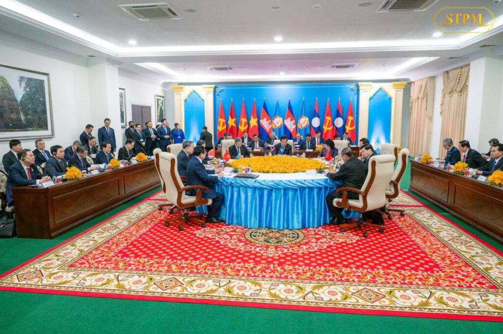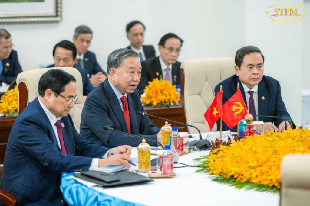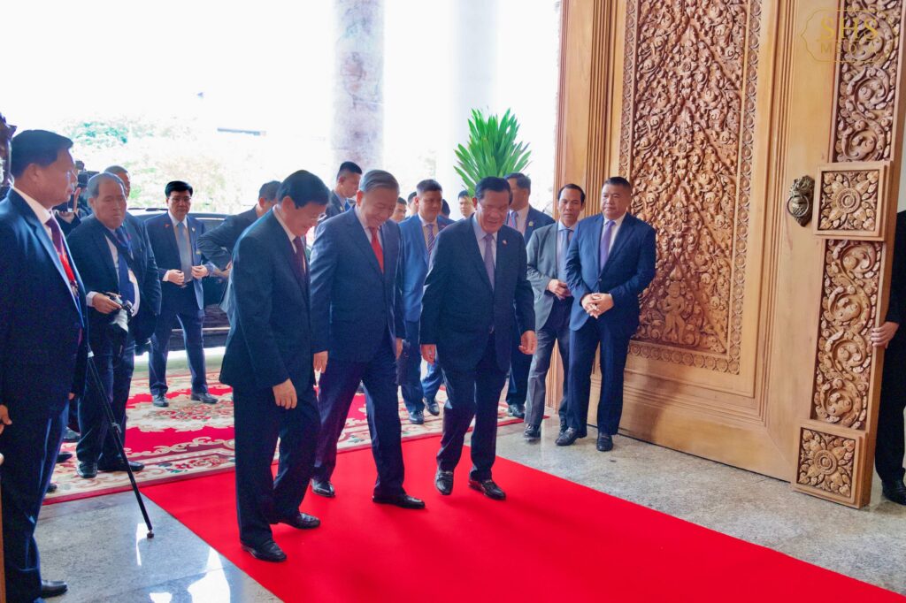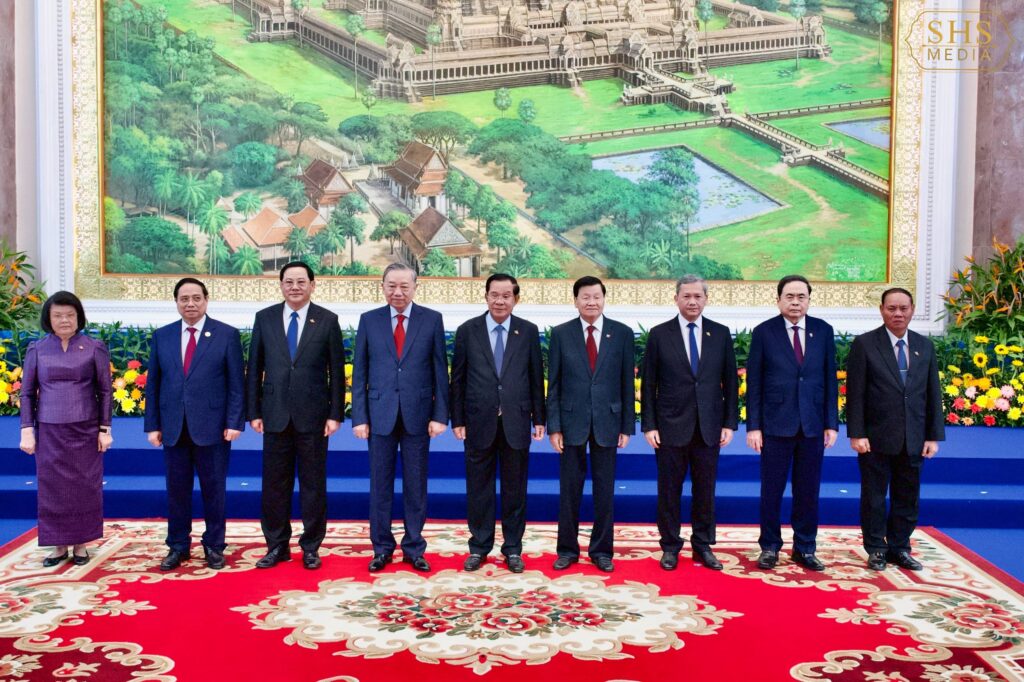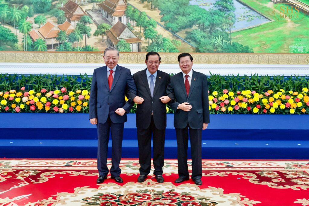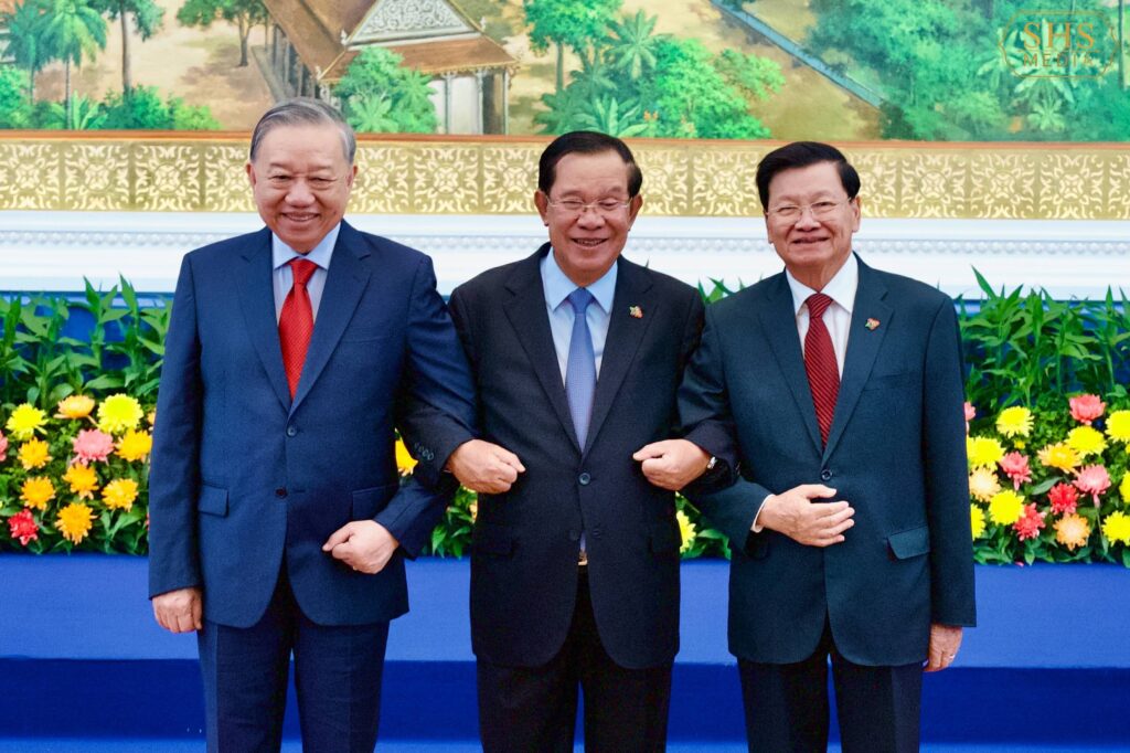 ភ្នំពេញ ៖ សម្ដេចអគ្គមហាសេនាបតីតេជោ ហ៊ុន សែន ប្រធានគណបក្សប្រជាជនកម្ពុជា អញ្ជើញទទួលស្វាគមន៍ការអញ្ជើញដល់វិមាន៧មករារបស់ ឯកឧត្តម តូ ឡឹម (To Lam) អគ្គលេខាធិការបក្សកុម្មុយនីសវៀតណាម និង ឯកឧត្តម ថងលូន ស៊ីសូលីត (Thongloun Sisoulith) អគ្គលេខាធិការបក្សប្រជាជនបដិវត្តន៍ឡាវ ដើម្បីចូលរួមកិច្ចប្រជុំកំពូលថ្នាក់ដឹកនាំនៃគណបក្សទាំង៣ ព្រមទាំងបានថតរូបអនុស្សាវរីយ៍រួមគ្នា នៅវិមាន៧មករា រាជធានីភ្នំពេញរសៀល ថ្ងៃសុក្រ ៤រោច ខែមាឃ ឆ្នាំម្សាញ់ សប្តស័ក ព.ស. ២៥៦៩ ត្រូវនឹង ថ្ងៃទី៦ ខែកុម្ភៈ ឆ្នាំ២០២៦៕ រក្សាសិទ្ធដោយ៖សុទ្ធលី