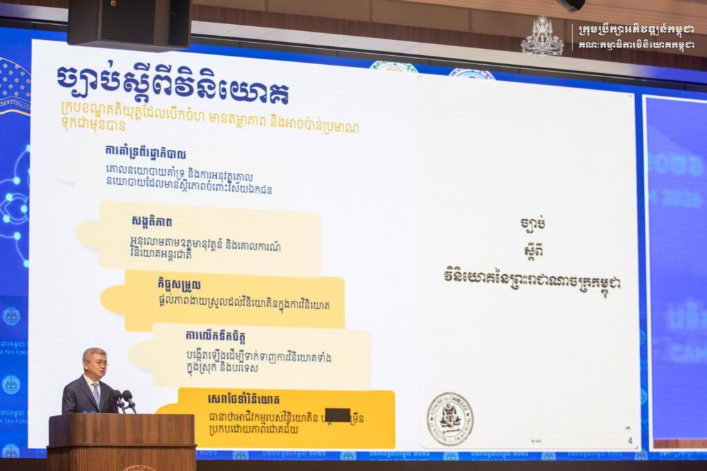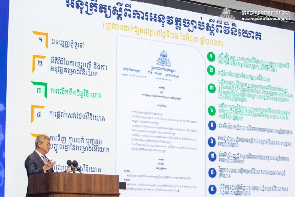 ឯកឧត្តមអគ្គលេខាធិការបានលើកទ្បើងនូវក្របខណ្ឌច្បាប់ស្តីពីវិនិយោគដែលត្រូវបានអនុម័តកាលពីឆ្នាំ២០២១ និងអនុក្រឹត្យនៃការអនុវត្តច្បាប់នេះដែលមានភាពបើកចំហ និងគ្រប់ជ្រុងជ្រោយ ដែលការណ៍នេះបានធ្វើឱ្យបរិស្ថានវិនិយោគនៅកម្ពុជាកាន់តែមានភាពទាក់ទាញ និងអំណោយផល។ ជាការកត់សម្គាល់ ការរួមផ្សំនៃកត្តាទាំងនេះបានធ្វើឱ្យការវិនិយោគក្នុងរយៈពេលប៉ុន្មានឆ្នាំចុងក្រោយនេះមានការកើនទ្បើងយ៉ាងគំហុក។