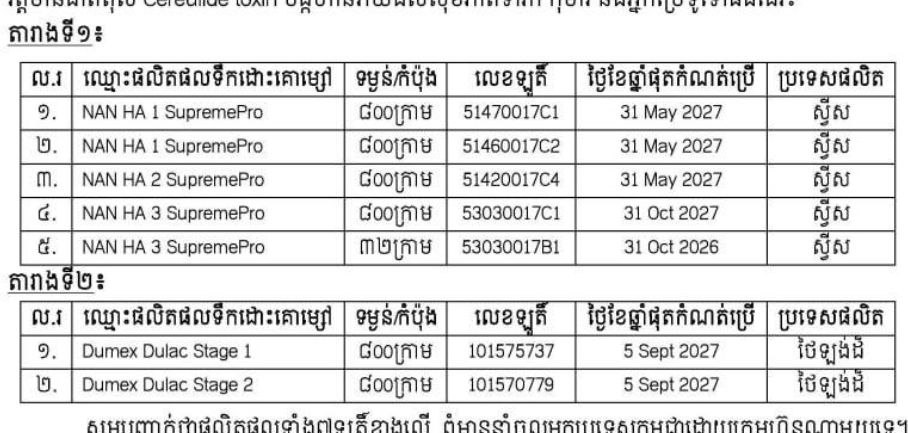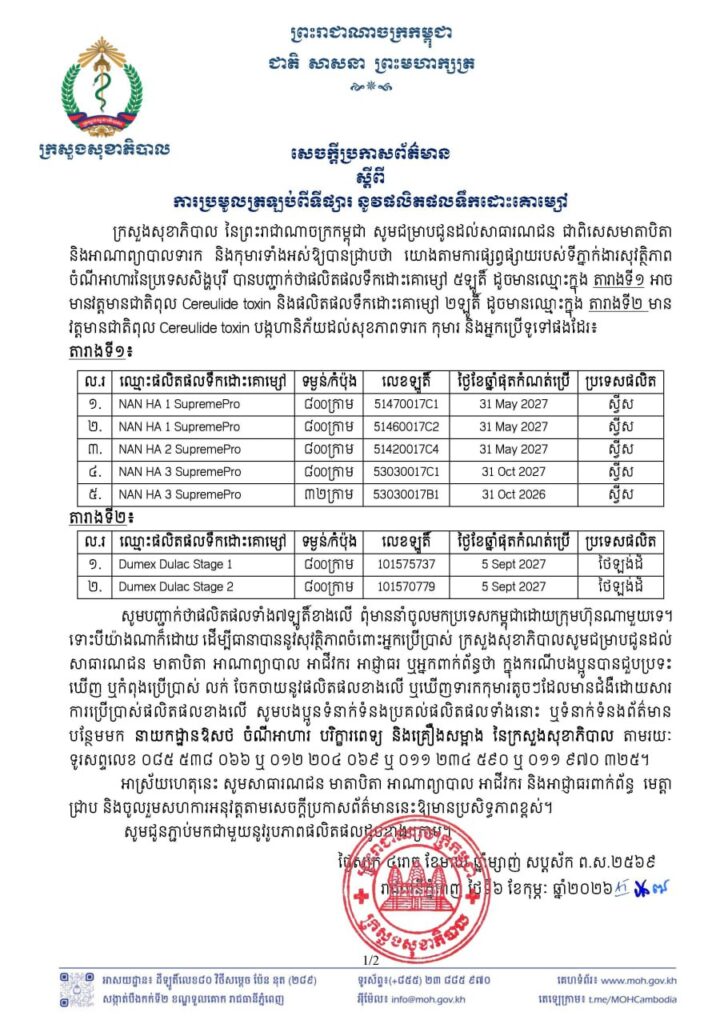 ក្រសួងសុខាភិបាល នៃព្រះរាជាណាចក្រកម្ពុជា សូមជម្រាបជូនដល់សាធារណជន ជាពិសេសមាតាបិតា និងអាណាព្យាបាលទារក និងកុមារទាំងអស់ឱ្យបានជ្រាបថា យោងតាមការផ្សព្វផ្សាយរបស់ទីភ្នាក់ងារសុវត្ថិភាព ចំណីអាហារនៃប្រទេសសិង្ហបុរី បានបញ្ជាក់ថាផលិតផលទឹកដោះគោម្សៅ ៥ឡូតិ៍ ដូចមានឈ្មោះក្នុង តារាងទី១ អាច មានវត្តមានជាតិពុល Cereulide toxin និងផលិតផលទឹកដោះគោម្សៅ ២ឡូតិ៍ ដូចមានឈ្មោះក្នុង តារាងទី២ មាន វត្តមានជាតិពុល Cereulide toxin បង្កហានិភ័យដល់សុខភាពទារក កុមារ និងអ្នកប្រើទូទៅផងដែរ៖