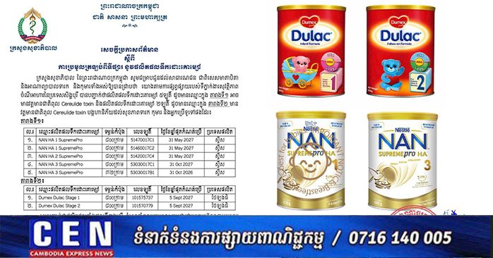 ភ្នំពេញ ៖ ក្រសួងសុខាភិបាល ចេញសេចក្តីប្រកាសព័ត៌មាន ស្តីពី ការប្រមូលត្រឡប់ពីទីផ្សារ នូវផលិតផលទឹកដោះគោម្សៅ៥ឡូតិ៍ ដូចមានឈ្មោះក្នុង តារាងទី១ អាច មានវត្តមានជាតិពុល Cereulide toxin និងផលិតផលទឹកដោះគោម្សៅ ២ឡូតិ៍ ដូចមានឈ្មោះក្នុង តារាងទី២ មាន វត្តមានជាតិពុល Cereulide toxin បង្កហានិភ័យដល់សុខភាពទារក កុមារ និងអ្នកប្រើទូទៅផងដែរ។