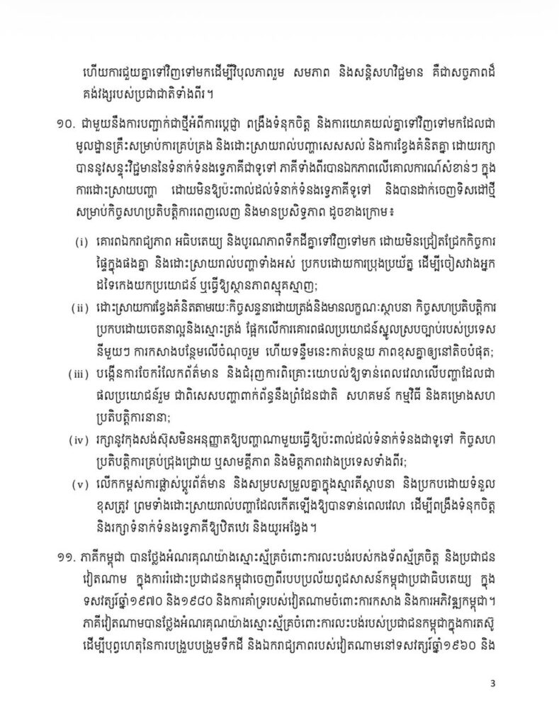 ៩. ក្នុងបរិបទនៃការវិវត្តក្នុងតំបន់ និងសកលលោកដ៏ស្មុគស្មាញ ភាគីទាំងពីរបានយល់កាន់តែស៊ីជម្រៅថា ភាពជាអ្នកជិតខាងល្អ និងមិត្តភាពប្រពៃណីរវាងកម្ពុជានិងវៀតណាមមិនអាចកាត់ផ្ដាច់ពីគ្នាបានឡើយហើយការជួយគ្នាទៅវិញទៅមកដើម្បីវិបុលភាពរួម សមភាព និងសន្តិសហវិជ្ជមាន គឺជាសច្ចភាពដ៏ គង់វង្សរបស់ប្រជាជាតិទាំងពីរ។