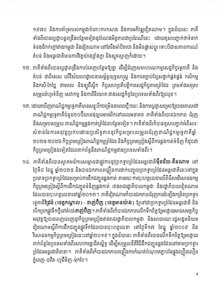 ១៤. ភាគីទាំងពីរបានស្វាគមន៍ការសម្ពោធជាផ្លូវការនូវច្រកទ្វារព្រំដែនអន្តរជាតិម៉ឺនជ័យ-តឹនណាម នៅ ថ្ងៃទី៨ ខែធ្នូ ឆ្នាំ២០២៥ និងបានឯកភាពពន្លឿនការដាក់បញ្ចូលច្រកទ្វារព្រំដែនអន្តរជាតិនេះទៅក្នុង ប្រភេទច្រកទ្វារព្រំដែនសម្រាប់ការដឹកជញ្ជូនឆ្លងកាត់ តាមរយៈការចុះហត្ថលេខាលើពិធីសារវិសោធនកម្ម កិច្ចព្រមព្រៀងស្តីពីការដឹកជញ្ជូនទំនិញឆ្លងកាត់ រវាងរាជរដ្ឋាភិបាលកម្ពុជា និងរដ្ឋាភិបាលវៀតណាម ដែលបានចុះហត្ថលេខានៅឆ្នាំ២០១៣។ ភាគីវៀតណាមក៏បានឯកភាពជំរុញការដំឡើងកម្រិតច្រកទ្វារ ទ្វេភាគីជ្រៃធំ (ខេត្តកណ្តាល) – ខាញ់ប៊ិញ (ខេត្តអានយ៉ាង) ឱ្យទៅជាច្រកទ្វារព្រំដែនអន្តរជាតិ និង បើកច្រកផ្លូវទឹកថ្មីនៅតំបន់ខាញ់ប៊ិញ។ ភាគីទាំងពីរក៏បានឯកភាពលើកទឹកចិត្តឱ្យអាជ្ញាធរមានសមត្ថកិច្ច
