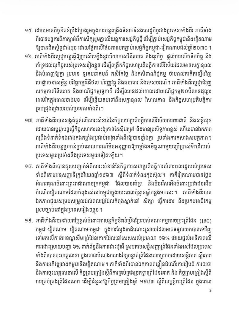 ៧. ភាគីទាំងពីរបានសម្ដែងនូវការពេញចិត្ត ចំពោះការរីកចម្រើនជាវិជ្ជមាន នៃទំនាក់ទំនងដ៏ជិតស្និទ្ធ និង កិច្ចសហប្រតិបត្តិការគ្រប់ជ្រុងជ្រោយរវាងកម្ពុជា និងវៀតណាម ក្នុងរយៈពេលប៉ុន្មានឆ្នាំកន្លងមកនេះ ដែលបាននាំមកនូវផលប្រយោជន៍ជាក់ស្ដែងសម្រាប់ប្រជាជននៃប្រទេសទាំងពីរ។ ថ្នាក់ដឹកនាំទាំង សងខាងបានស្វាគមន៍ចំពោះការប្រាស្រ័យទាក់ទងគ្នាកម្រិតខ្ពស់ជាបន្តបន្ទាប់ និងទំនាក់ទំនងនៅគ្រប់ កម្រិតលើគ្រប់វិស័យ ដែលបានពង្រឹងមិត្តភាពជាប្រពៃណីបន្ថែមទៀត និងពង្រីកកិច្ចសហប្រតិបត្តិការ ទ្វេភាគីឱ្យកាន់តែមានប្រសិទ្ធភាព និងប្រកបដោយផ្លែផ្កា។