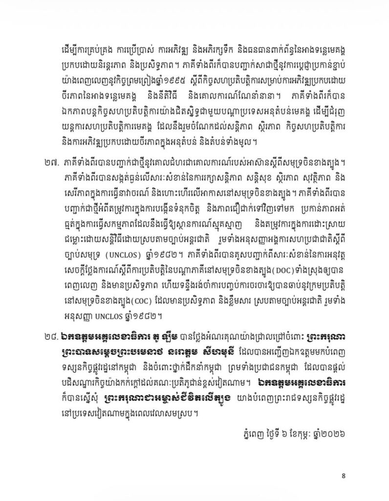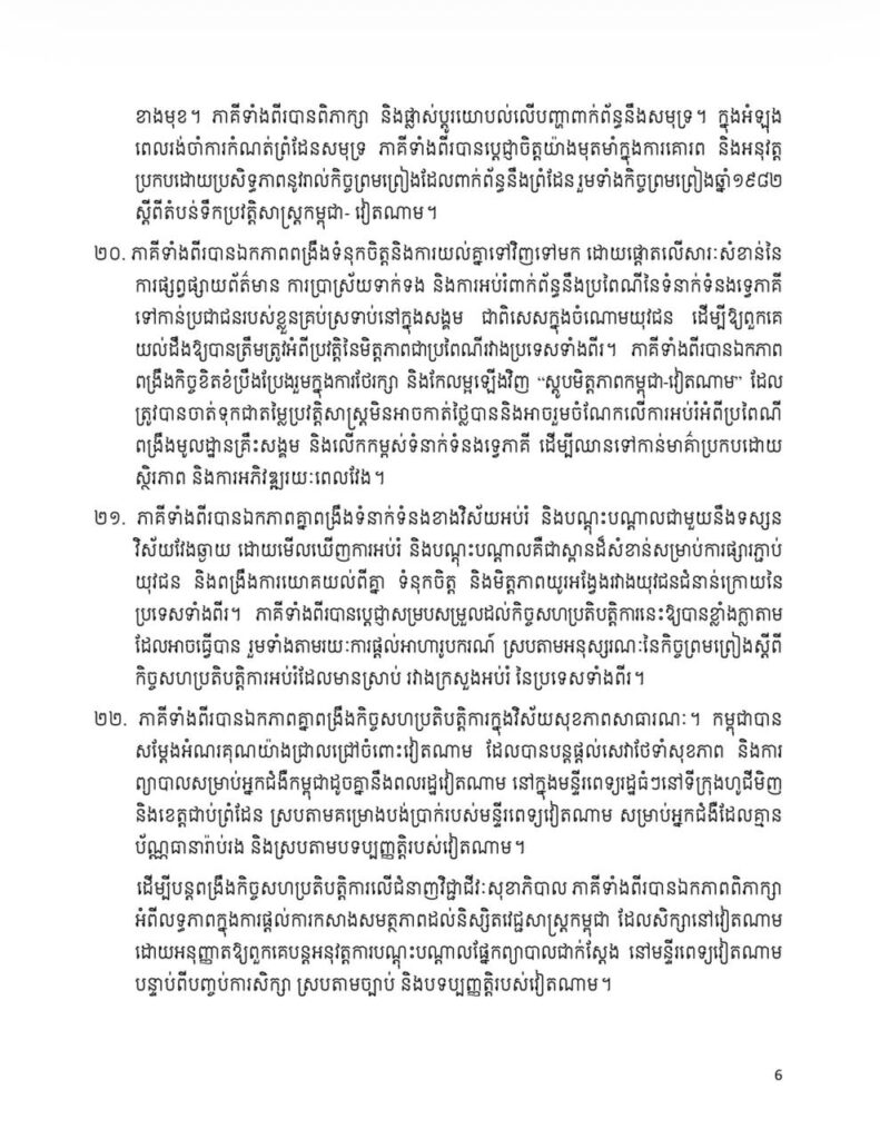 ៨. ភាគីទាំងពីរបានបញ្ជាក់សាជាថ្មីនូវជំហរឥតងាករេ ក្នុងការផ្តល់សារៈសំខាន់ពិសេសចំពោះភាពជា អ្នកជិតខាងល្អ មិត្តភាពប្រពៃណី កិច្ចសហប្រតិបត្តិការគ្រប់ជ្រុងជ្រោយ និងទំនាក់ទំនងប្រកបដោយ ស្ថិរភាពយូរអង្វែងរវាងកម្ពុជា និងវៀតណាម ព្រមទាំងប្តេជ្ញាជួយ គាំទ្រគ្នាទៅវិញទៅមក ដើម្បីការ អភិវឌ្ឍ សន្តិភាព ស្ថិរភាព និងវិបុលភាព។