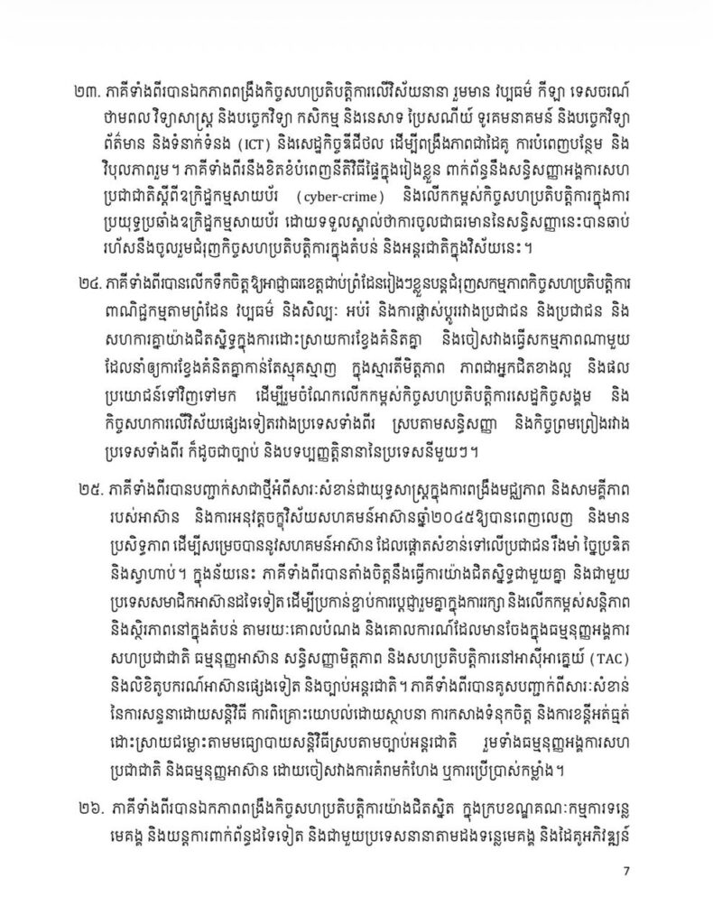 ២៣. ភាគីទាំងពីរបានឯកភាពពង្រឹងកិច្ចសហប្រតិបត្តិការលើវិស័យនានា រួមមាន វប្បធម៌ កីឡា ទេសចរណ៍ ថាមពល វិទ្យាសាស្ត្រ និងបច្ចេកវិទ្យា កសិកម្ម និងនេសាទ ប្រៃសណីយ៍ ទូរគមនាគមន៍ និងបច្ចេកវិទ្យា ព័ត៌មាន និងទំនាក់ទំនង (ICT) និងសេដ្ឋកិច្ចឌីជីថល ដើម្បីពង្រឹងភាពជាដៃគូ ការបំពេញបន្ថែម និង វិបុលភាពរួម។ ភាគីទាំងពីរនឹងខិតខំបំពេញនីតិវិធីផ្ទៃក្នុងរៀងខ្លួន ពាក់ព័ន្ធនឹងសន្ធិសញ្ញាអង្គការសហ ប្រជាជាតិស្តីពីឧក្រិដ្ឋកម្មសាយប័ (cyber-crime) និងលើកកម្ពស់កិច្ចសហប្រតិបត្តិការក្នុងការ ប្រយុទ្ធប្រឆាំងឧក្រិដ្ឋកម្មសាយប័រ ដោយទទួលស្គាល់ថាការចូលជាធរមាននៃសន្ធិសញ្ញានេះបានឆាប់ រហ័សនឹងចូលរួមជំរុញកិច្ចសហប្រតិបត្តិការក្នុងតំបន់ និងអន្តរជាតិក្នុងវិស័យនេះ។