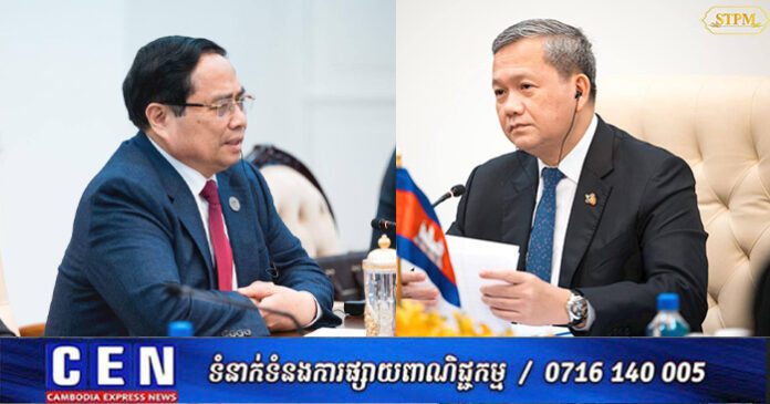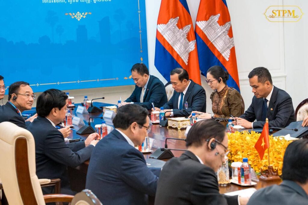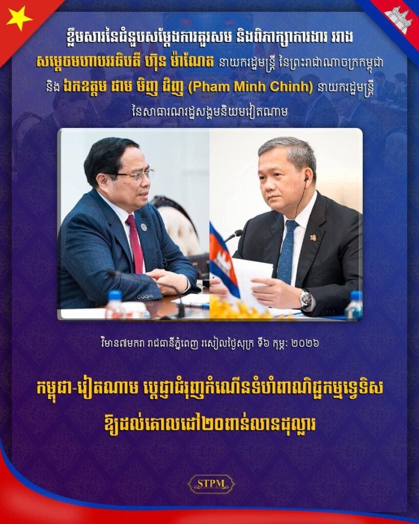 នារសៀលថ្ងៃទី០៦ ខែកុម្ភៈ ឆ្នាំ២០២៦, សម្តេចមហាបវរធិបតី ហ៊ុន ម៉ាណែត នាយករដ្ឋមន្រ្តី នៃព្រះរាជាណាចក្រកម្ពុជា បានទទួលជួបពិភាក្សាការងារជាមួយ ឯកឧត្តម ផាម មិញជិញ (PHAM Minh Chinh) នាយករដ្ឋមន្ត្រី នៃសាធារណរដ្ឋសង្គមនិយមវៀតណាម នៅវិមាន៧មករា ក្នុងឱកាសដែលឯកឧត្តមនាយករដ្ឋមន្ត្រីវៀតណាម បានអញ្ជើញចូលរួមកិច្ចប្រជុំរវាងថ្នាក់ដឹកនាំគណបក្សប្រជាជនកម្ពុជា, ថ្នាក់ដឹកនាំគណបក្សកុម្មុយនីស្តវៀតណាម និងថ្នាក់ដឹកនាំគណបក្សប្រជាជនបដិវត្តន៍ឡាវ នៅរាជធានីភ្នំពេញ ព្រះរាជាណាចក្រកម្ពុជា ពីថ្ងៃទី៦ដល់ថ្ងៃទី៧ ខែកុម្ភៈ ឆ្នាំ២០២៦។