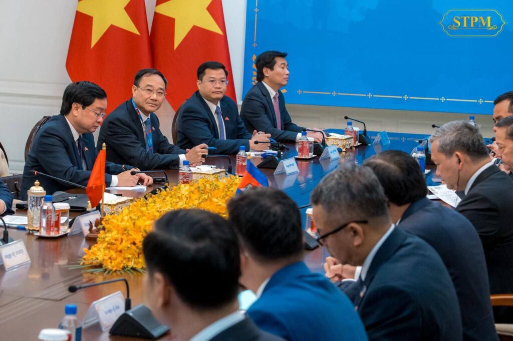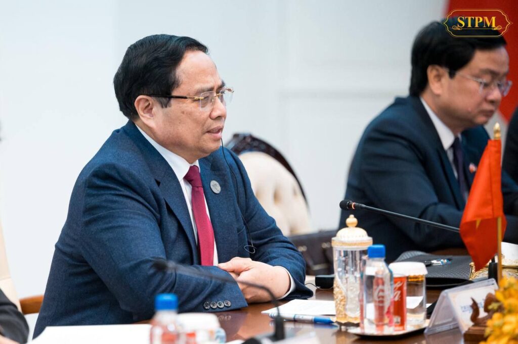 ក្នុងឱកាសនៃជំនួប, សម្ដេចបវរធិបតី បានសម្ដែងនូវសេចក្ដីសោមនស្សរីករាយ និងការស្វាគមន៍យ៉ាងកក់ក្ដៅជូនចំពោះ ឯកឧត្តម ផាម មិញជិញ និងគណៈប្រតិភូ ដែលបានអញ្ជើញចូលរួមកិច្ចប្រជុំកំពូលបីគណបក្ស លើកទី៤ ដែលកម្ពុជាធ្វើជាម្ចាស់ផ្ទះ បន្ទាប់ពីកិច្ចប្រជុំលើកទី៣ កាលពីខែកុម្ភៈ ឆ្នាំ២០២៥ ទីក្រុងហូជីមិញ នៃសាធារណរដ្ឋសង្គមនិយមវៀតណាម។