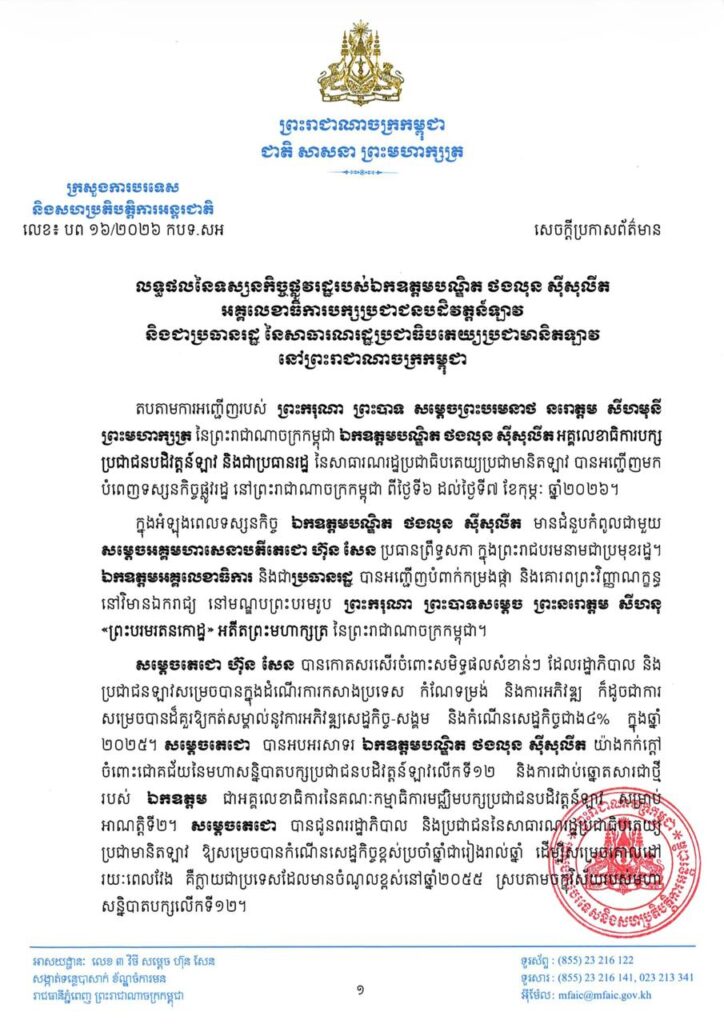 រាជធានីភ្នំពេញ ៖នៅថ្ងៃទី ៧ ខែកុម្ភៈ ឆ្នាំ២០២៦ក្រសួងការបរទេស និងសហប្រតិបត្តិការអន្តរជាតិ បានចេញសេចក្តីប្រកាសព័ត៌មានលទ្ធផលនៃទស្សនកិច្ចផ្លូវរដ្ឋរបស់ឯកឧត្តមបណ្ឌិត ថងលុន ស៊ីសុលីត អគ្គលេខាធិការបក្សប្រជាជនបដិវត្តន៍ឡាវនិងជាប្រធានរដ្ឋ នៃសាធារណរដ្ឋប្រជាធិបតេយ្យប្រជាមានិតឡាវ នៅព្រះរាជាណាចក្រកម្ពុជា។